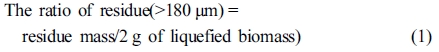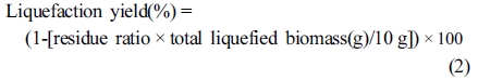 바이오매스 액화율. 상온에 식힌 바이오매스 액화반응기내의 총 액화바이오매스(total liquefied biomass) 중에서 2 g을 50 mL아세톤에 넣고 하루 동안 용해시켰다. 용해된 시료를 180 μm(No. 80, 80 mesh) 표준체에 통과시켜서 통과하지 못하고 걸러진 고상의 residue를 제거하고, 통과된 시료를 105 ℃에서 건조하여 무게를 측정하고, residue의 건조무게를 측정하여 액화율(liquefaction yield)을 eq. (1)과 (2)와 같이 산출하였다.