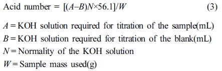 산가. ASTM D4662에 따라 액화바이오매스 2 g을 50 mL의 에탄올에 넣고 교반시키고 1% phenolphthalein용액 1 mL를 넣은 후 하루 동안 교반시켰다. pH meter(720P istek)로 초기 pH를 측정하고 0.1 N KOH용액을 떨어뜨리면서 색이 변하는 시점의 양을 종말점으로 적정하였다. 공시약(blank)은 50 mL의 에탄올에 1 mL의 1% phenolphthalein용액을 넣고 교반시킨 후 동일한 방법으로 0.1 N KOH 용액으로 적정하였다. 적정 후에 산가(acid number)를 eq. (3)을 사용하여 구하였다.