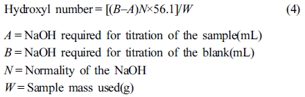 OH가. ASTM D4274에 따라 액화바이오매스 1 g을 25 mL phthalation reagent에 넣고 heating stirrer를 이용하여 110 ℃에서 20분 동안 교반시켰다. 교반 후 50 mL의 pyridine과 25 mL의 증류수를 첨가하고 1 mL의 1% phenolphthalein 용액을 첨가하여 교반하였다. pH meter(720P istek)로 초기 pH를 측정하고 1 M NaOH 용액을 떨어뜨리면서 색이 변하는 시점의 양을 종말점으로 적정하였다. 공시약(blank)은 25 mL phthalation reagent에 50 mL의 pyridine과 25 mL의 증류수를 첨가하고 1 mL의 1% phenolphthalein 용액을 첨가하여 교반시킨 후 동일한 방법으로 1 M NaOH 용액으로 적정하였다. 적정 후에 OH가(hydroxyl number)를 eq. (4)를 사용하여 구하였다.