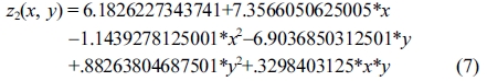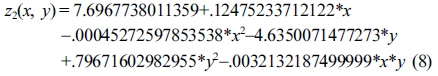 Response surface equation of model-predicted MCC yield(z2) versus [SBR(x) and sulfuric acid concentration(y)]: