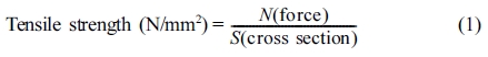 측정. 합성된 TPU의 분자량을 측정하기 위해 gel permeation chromatography(GPC) Empower 2를 사용하였다. 시료를 N,N-dimethylformamide(DMF)에 0.1% w/w 농도로 녹인 후 측정하였으며, 아니졸(anisole)을 기준으로 하여 1 mL/min의 속도로 측정하였다. 합성된 TPU의 합성 확인과 구조 분석을 위해 Fourier transform infrared spectroscopy(FTIR) Jasco 460 Plus spectrometer와 Nicolet 6700을 측정하였다. 400~4000 cm-1의 범위를 설정하여 실온에서 측정하였다. TPU의 열적 성질과 기계적 성질을 확인하기 위해 differential scanning calorimetry(DSC, TA Instruments Q20) 측정 시 온도는 -50~200 ℃로 하였으며, 승온 속도는 20 ℃/min으로 질소 분위기하에서 실시하였으며, universal testing machine(UTM) load cell은 50 kg이며 crosshead speed는 50 mm/min로 하여 측정하였다. 인장강도는 각각의 시료를 5회 측정한 후 평균값을 내어 식 (1)을 이용하여 구하였다.