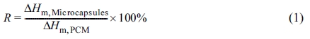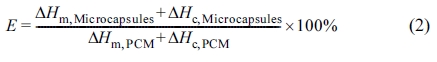 where ΔHm,PCM and ΔHc,PCM are the melting and crystallization enthalpies of pure eicosane, respectively. ΔHm,Microcapsules and ΔHc,Microcapsules are the melting and crystallization enthalpies of eicosane in microcapsules, respectively.