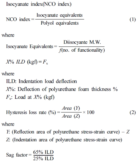 폴리우레탄 폼은 폴리올과 이소시아네이트 및 각종 첨가제가 화학적 반응을 일으켜 생성되는 블록 공중합체로써 자동차용 시트에는 점탄성 특성을 지닌 우레탄 폼을 사용하게 된다. 우레탄 폼의 화학적 구조는 경질부분(hard segment)과 연질부분(soft segment)으로 구분 지을 수 있다. 경질부분은 주로 이소시아네이트에 의해 영역을 형성하게 되며, 폴리우레탄 폼의 기계적 물성에 주로 영향을 끼친다. 연질부분은 폴리올에 의해 형성되며 폴리우레탄 폼의 탄성 및 감쇠(damping) 물성에 영향을 끼친다.2-7 폴리우레탄 폼 내 경질부분과 연질부분의 비율을 조절함으로써 전반적인 재료적 물성거동 특성을 변화시킬 수 있으며, NCO 당량비(NCO index)를 통해 해당 비율을 가늠해 볼 수 있다. 이소시아네이트기(-NCO)와 폴리올 및 각종 첨가제에 포함되는 수산화기(-OH) 당량비를 NCO 당량비라 하며 이를 식 (1)에 나타내었다. NCO 당량비가 100인 경우 이소시아네이트기와 수산화기가 1:1 반응비율로 폴리우레탄 폼을 제조한 것을 의미하며 NCO 당량비가 100 이상인 경우 경질부분인 이소시아네이트가 과량으로 투입되어 전반적인 폴리우레탄 폼의 경도가 상승, 반면 유연성(flexibility)이 감소하는 특성을 나타나게 된다.8 이러한 특성을 이용하여 폴리우레탄 폼 배합을 변경함으로써, 시트 패드의 다양한 안락감 물성을 구현할 수 있다.