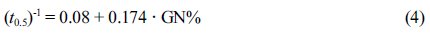 It can be seen that the temperature of the polymer dropped with the elapsed time, while its crystallinity increased gradually. Both kinds of curves took the shape of an “arc” with a leveling-off in the later stage. Compared with our previous work, there is no apparent “phase-change platform” that can be seen,27 which is because the temperature drop was quite fast, leading to considerable decrease in the time span of the crystallization process. Figure 5 presents the Avrami curve fitting of the Xt versus crystallization time, with the crystallization half time (t0.5) labeled in the plots which is generally used as a measure of overall crystallization rate (cf. Table 2). Interestingly, there existed a linear correlation between (t0.5)-1 and GN% as follows:
