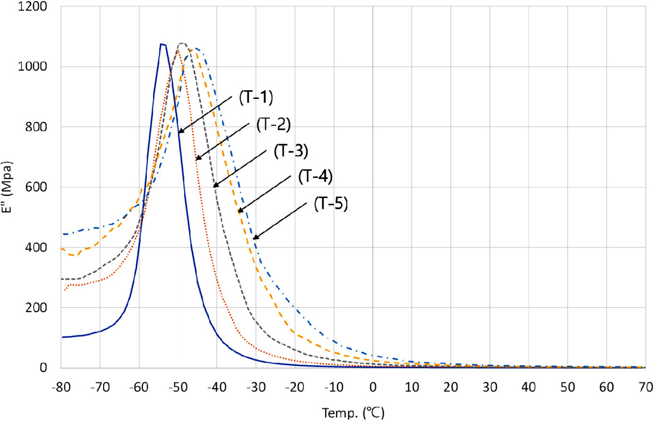 동적·기계적 성질. 동적·기계적 성질인 storage modulus(E'), loss modulus(E'') 그리고 viscoelasticity(tand)는 Gabo사 DMTS(dynamic mechanical thermal spectometer) Eplexor 500 N을 사용하여 시편 가로 5 mm, 세로 15 mm, 두께 2 mm의 시편을 사용하여 동적·기계적 특성을 측정하였으며, 측정은 액체질소를 충전하여 -80 ℃부터 70 ℃까지의 온도범위로 승온속도는 5 ℃/min의 조건으로 10 Hz에서 행하였다.