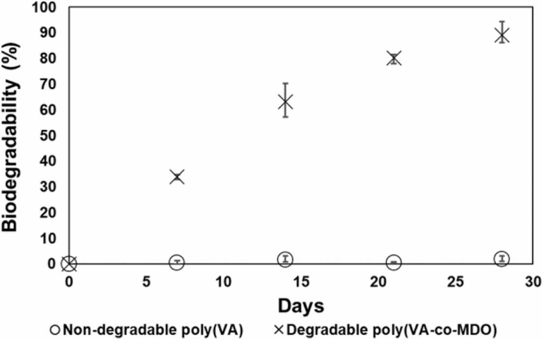 연구팀은 PVAc, PMDO와 다양한 함량을 가진 VAc-MDO random copolymer(VAc-co-MDO)를 중합하여 MDO에 의해 생성된 에스터 결합이 생 분해성에 어떠한 변화가 발생하는지에 대한 연구를 진행했다. PVAc homopolymer 및 poly[VAc(0.88)-co-MDO(0.12)]를 중합하여 생분해성 시험을 진행한 결과 PVAc homopolymer는 거의 분해되지 않았고, VAc-co-MDO는 약 89% 분해된 것을 확인했다(Figure 7). 이 결과를 통해 PVAc사슬에 분해 가능한 에스터 유닛의 도입이 PVAc 사슬의 생분해성을 높이는 결과를 보였다.
