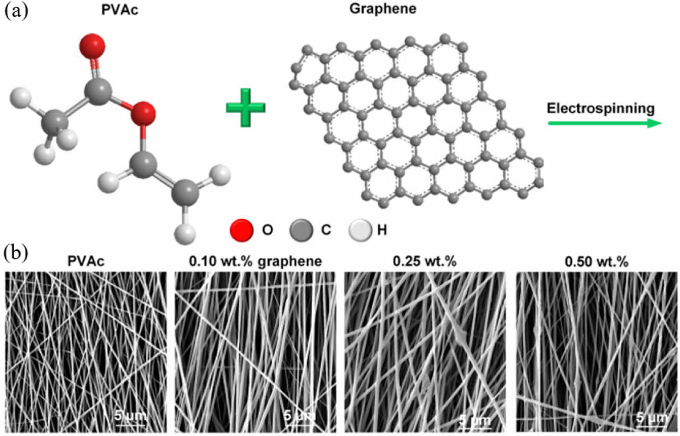 Figure 8 (a) Chemical structure of PVAc and graphene; (b) SEM micrographs comparing the morphologies of the pristine PVAc nanofibers with the graphene-loaded PVAc nanofibers. Reproduced with permission from Ref. 105, Sengupta, D. et al., ACS Appl. Mater. Interfaces, 2023, 15, 22351-22366. ©2023, American Chemical Society |