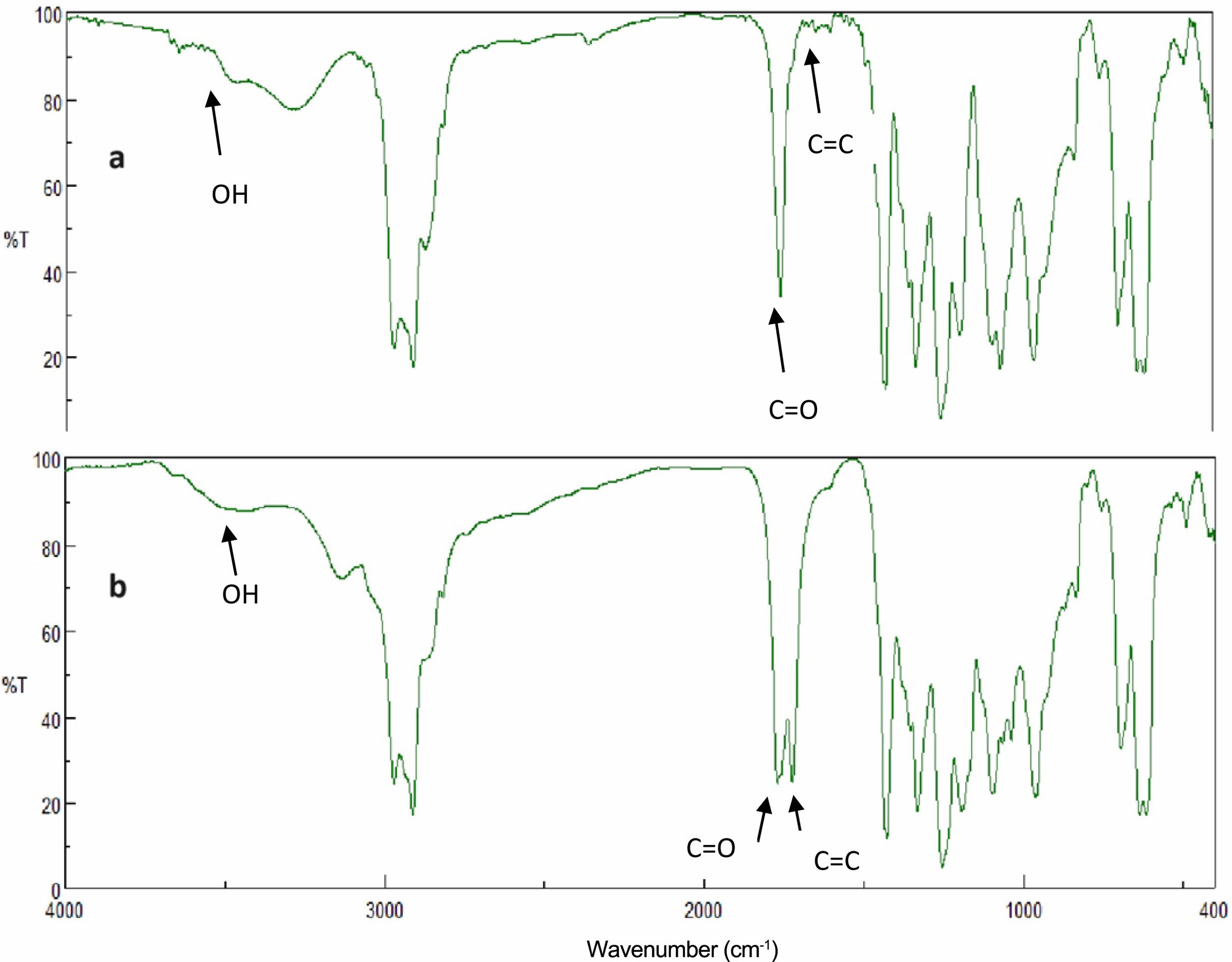 FTIR Spectrophotometer Examination. As they were exposed to a wavelength of 365 nm for 300 h, PVC films underwent oxidative photodegradation. This process resulted in the formation of unwanted chemicals, including reactive hydroxyl groups and small polymeric fragments containing carbonyl groups (C=O; from the carboxyl and ketone). Additionally, the polyene groups (C=C; from residues) were detected.25 Figure 1 (a) and (b) illustrates the peak intensity of the plain sample, (a) representing the state before irradiation and (b) representing the state after irradiation. Here, the peaks corresponding to O-H, C=O, and C=C groups were noticeably elevated at 3500 cm-1, 1722 cm-1, and 1602 cm-1, respectively.
