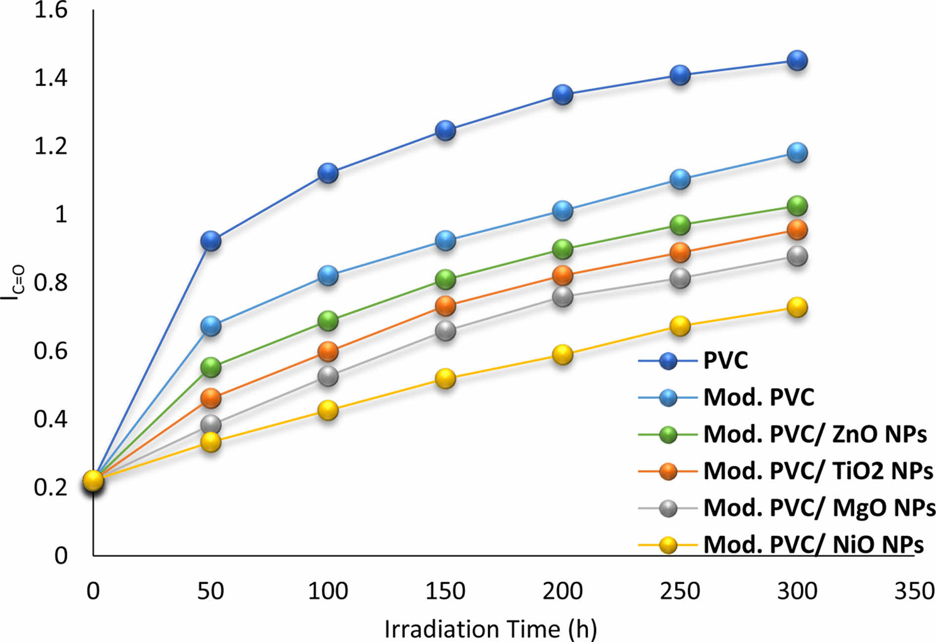 Irradiation of PVC Films by UV Radiation. The plain, chemically modified, and NP-filled PVC films were subjected to UV light irradiation with a wavelength of 365 nm and a light source intensity of 1.052 × 10−8 ein·dm−3·s−1 at a temperature of 25 ℃ for a duration of 300 h. This experiment was performed to examine the films' ability to withstand photodegradation and determine the improvement produced by adding metal oxide nanoparticles.