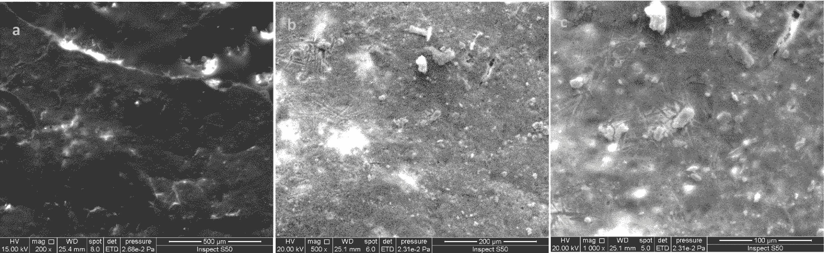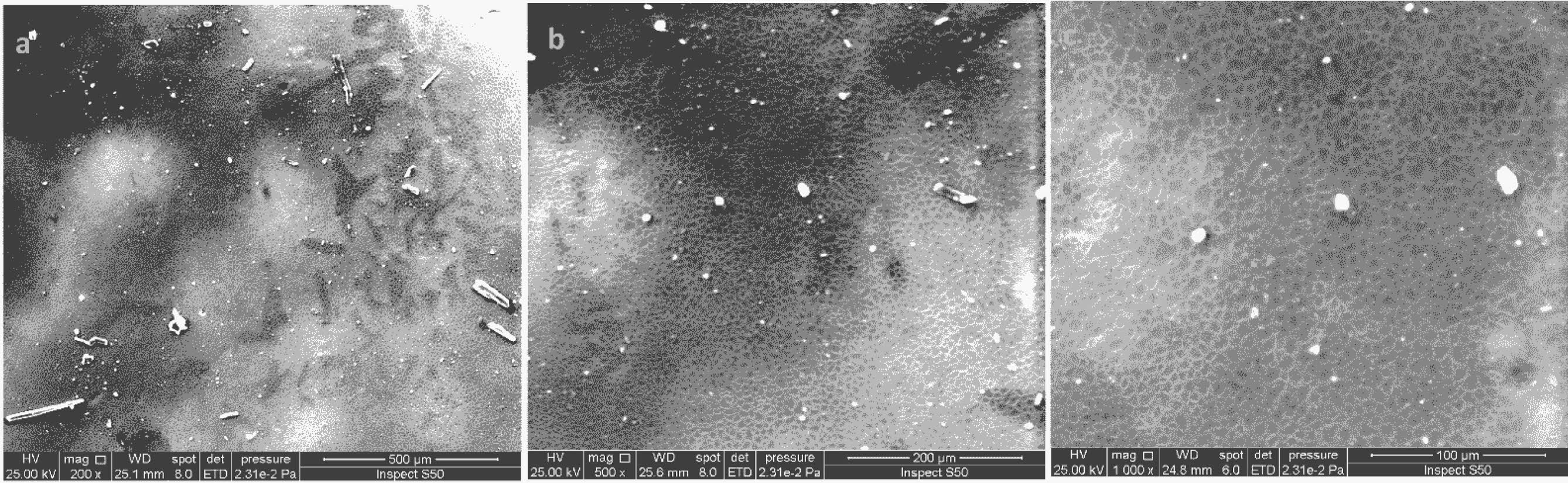 SEM Testing: To obtain high-resolution images of the polymeric film morphology, the SEM technique was utilized.30 SEM images at three magnification levels illustrate the impact of irradiation on the plain, modified, and NPs-filled PVC films are shown in Figures 8, 9, and 10-13, respectively. Compared to the irradiated blank PVC film, the surface of the modified and NPs-filled PVC films displayed a smoother and cleaner appearance. The modified PVC films exhibited distinct morphological surfaces due to the presence of particles, which may appear as pores. The morphology of the modified PVC films revealed a honeycomb-like structure, incorporating ZnO, TiO2, MgO, and NiO NPs. Fig. 11  Fig. 12