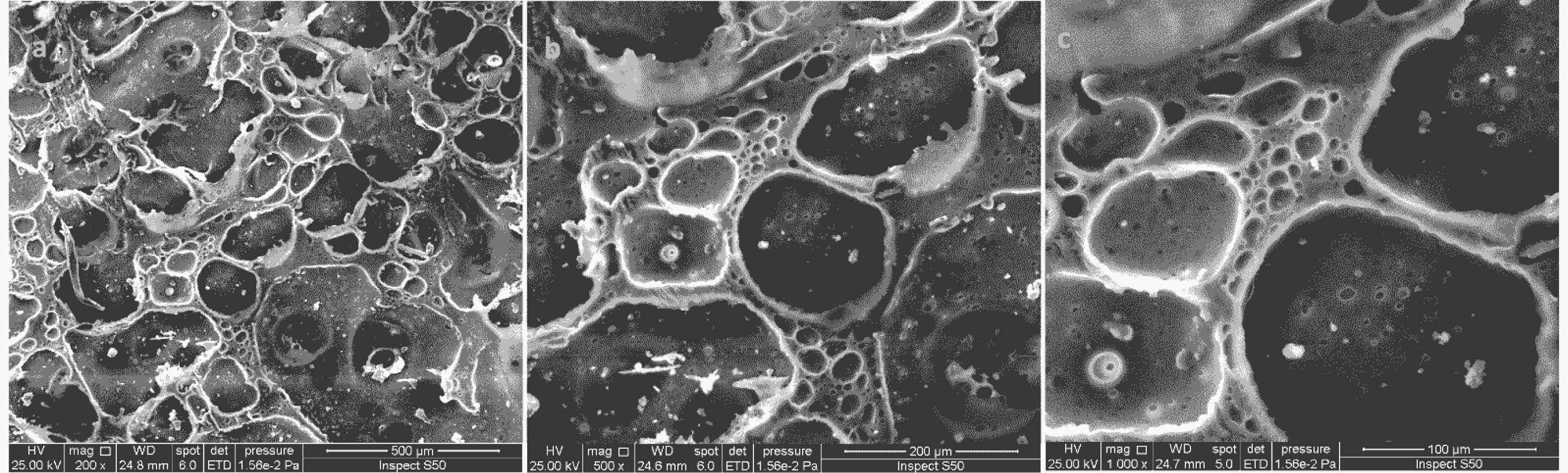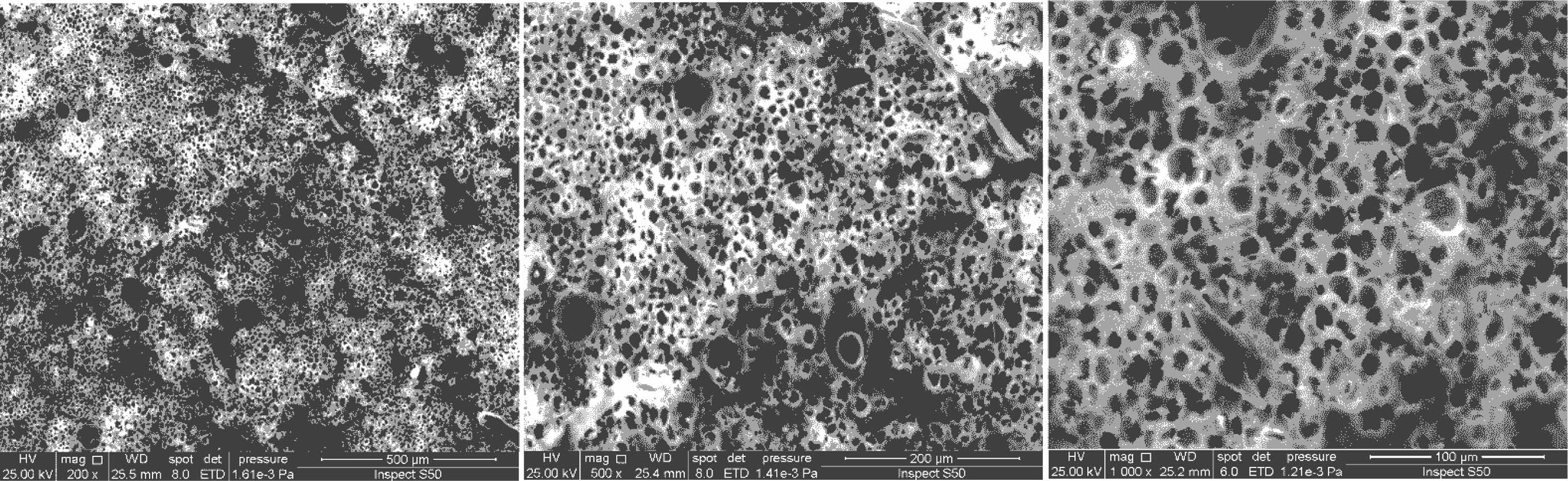 A sponge-like structure is a common shape observed in the sub-layers of membranes, as shown in Figure 13.31-33 There are two distinct forms of sponge-like structures: one is the interconnected network type, and the other is a closed-cell type consisting of isolated individual cells. A perfect asymmetric membrane consisting of a thin outer layer and a porous inner linked structure are observed. The extensive interconnection of the porous substructure, while difficult to measure precisely, is essential for reducing resistance to the movement of mass.32 This structure is favored because of its exceptional mechanical merits in comparison to other structures.33