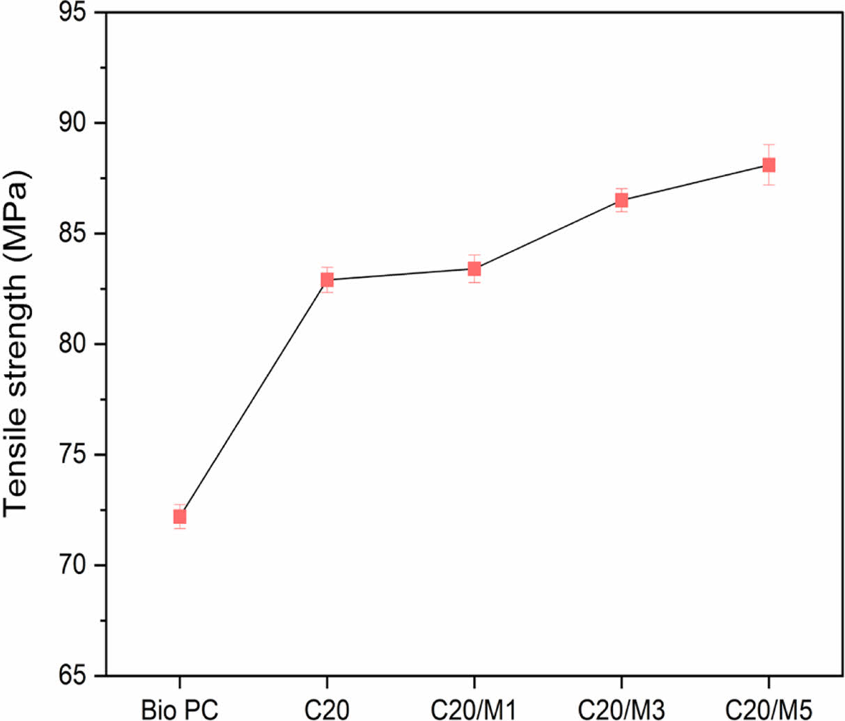 Bio PC/CNF 나노복합체 기계적 물성 분석. 상용화제 적용에 따른 물성 변화를 확인하기 위해 CNF 및 상용화제 첨가에 따른 Bio PC/CNF 나노복합체의 기계적 물성을 측정하였다. 인장강도는 ASTM D638 표준에 따라 길이 64 mm, 폭 3 mm, 두께 3 mm의 Type 5 시편을 제작하였으며, universal testing machine(UTM, AGX–1kNVD, Shimadzu, Japan)을 사용하여 로드셀 1 kN에서 cross head speed 5 mm/min의 속도로 상온에서 인장 변형을 가하여 물성을 측정하였다.