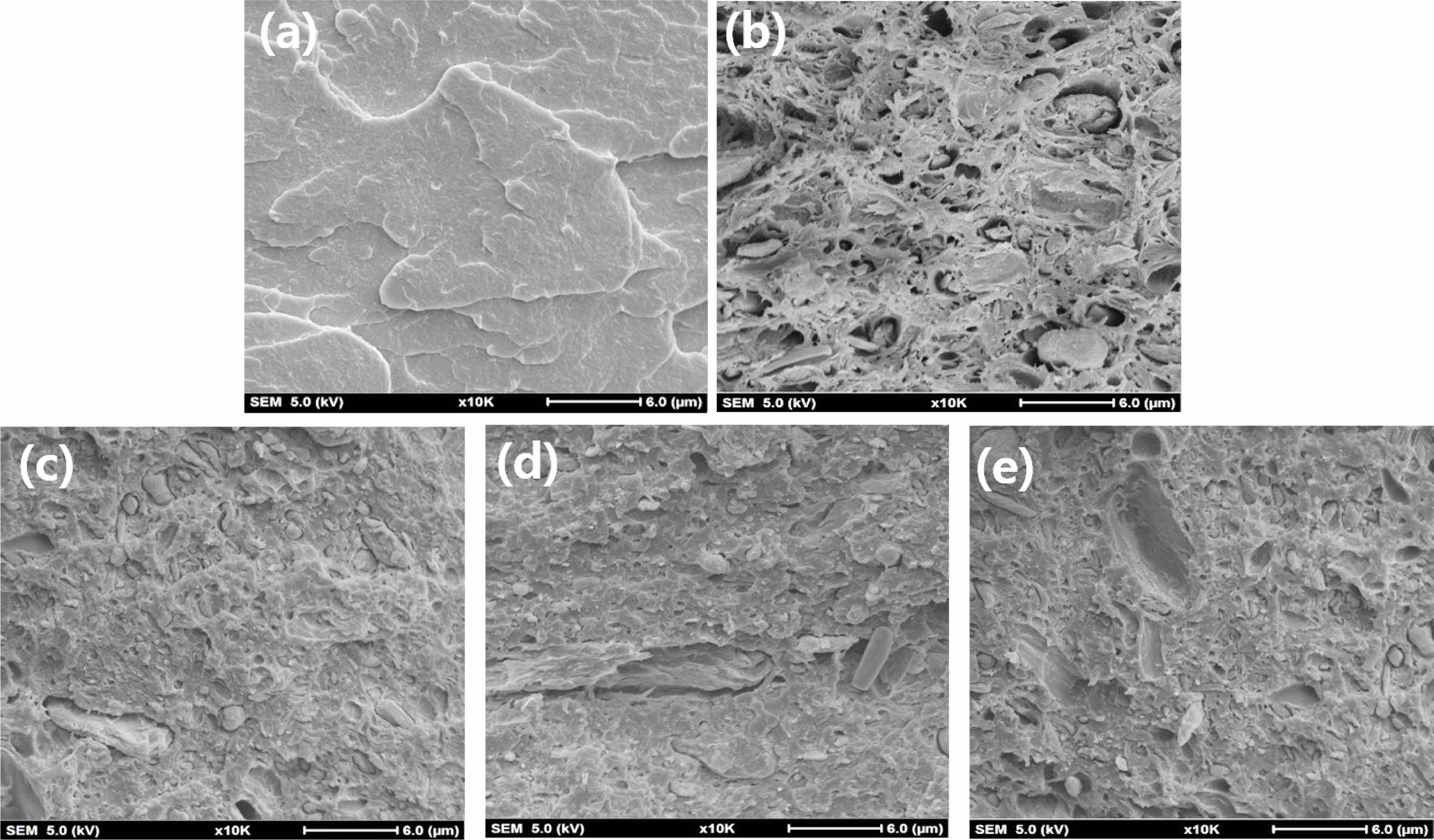 Bio PC/CNF 나노복합체 표면 특성 분석. Bio PC/CNF 나노복합체 내에서 Bio PC-g-MA가 두 소재의 계면 접착 특성에 미치는 영향을 분석하기 위하여 FIB-SEM을 이용하여 인장강도 시험 후 시편의 파단면을 관찰하였다. Bio PC/CNF 나노복합체의 물성 향상 효과가 뛰어난 Bio PC-g-MA 상용화제를 적용한 시편의 파단면과 첨가하지 않은 시편의 파단면을 비교하여 Figure 6에 나타내었다. 상용화제를 첨가하지 않은 Figure 6(b)의 경우, 친수성인 CNF와 소수성의 Bio PC의 계면에서 공극 및 계면 찢김 현상이 관찰되었고, 이는 두 소재의 약한 계면 접착력에 의해 발생한 것으로 판단된다. Figure 6(e)를 통해 Bio PC-g-MA 상용화제가 두 소재 간의 계면 접착력을 증진시켜 CNF가 Bio PC 매트릭스에 더욱 고르게 분포되어 있음을 확인함과 동시에 공극과 계면 찢김 현상이 감소하고 표면 상태가 보다 안정된 형태를 이루는 것을 관찰할 수 있었다. 앞선 기계적 물성의 향상된 결과를 근거로 Bio PC-g-MA 상용화제가 Bio PC와 CNF의 계면 접착 특성을 향상시키며 이로 인해 Bio PC/CNF 나노복합체의 물성 향상에 영향을 미치는 것으로 판단된다.10,27,28