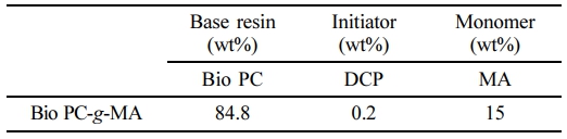 거한 후, 60 ℃에서 24시간 건조하였다.19,20 개시제 및 MA 함량에 따른 Bio PC-g-MA 배합비는 Table 1에 나타내었다.