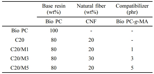 시약 및 재료. 실험에 사용된 Bio PC(TRIECO, Samyang, Korea)는 Isosorbide를 원료로 제조한 바이오매스 함량 50%인 소재를 사용하였고, 물성 향상을 위한 친환경 섬유는 Width 10-50 nm의 파우더 형태인 Cellulose nanofiber(WFo–UNDP, Sugino, Japan)을 선정하였다. Bio PC와 친환경 섬유 사이의 계면 접착력 향상을 위해 상용화제인 Bio PC-g-MA를 반응압출 공정을 통해 제조하였다. 상용화제는 Bio PC 주사슬에 grafting monomer로써 maleic anhydride(MA, OCI, Korea)과 그래프트 반응을 위한 개시제로는 di–cumyl hydroperoxide (DCP, Dongsung chemical, Korea)를 사용하였다. 제조된 Bio PC-g-MA 상용화제의 미반응 MA 제거를 위해 아세톤(Samchun, Korea)을 사용하였다. 모든 재료는 시편 제조 전 60 ℃에서 6시간 건조 후 사용하였다.