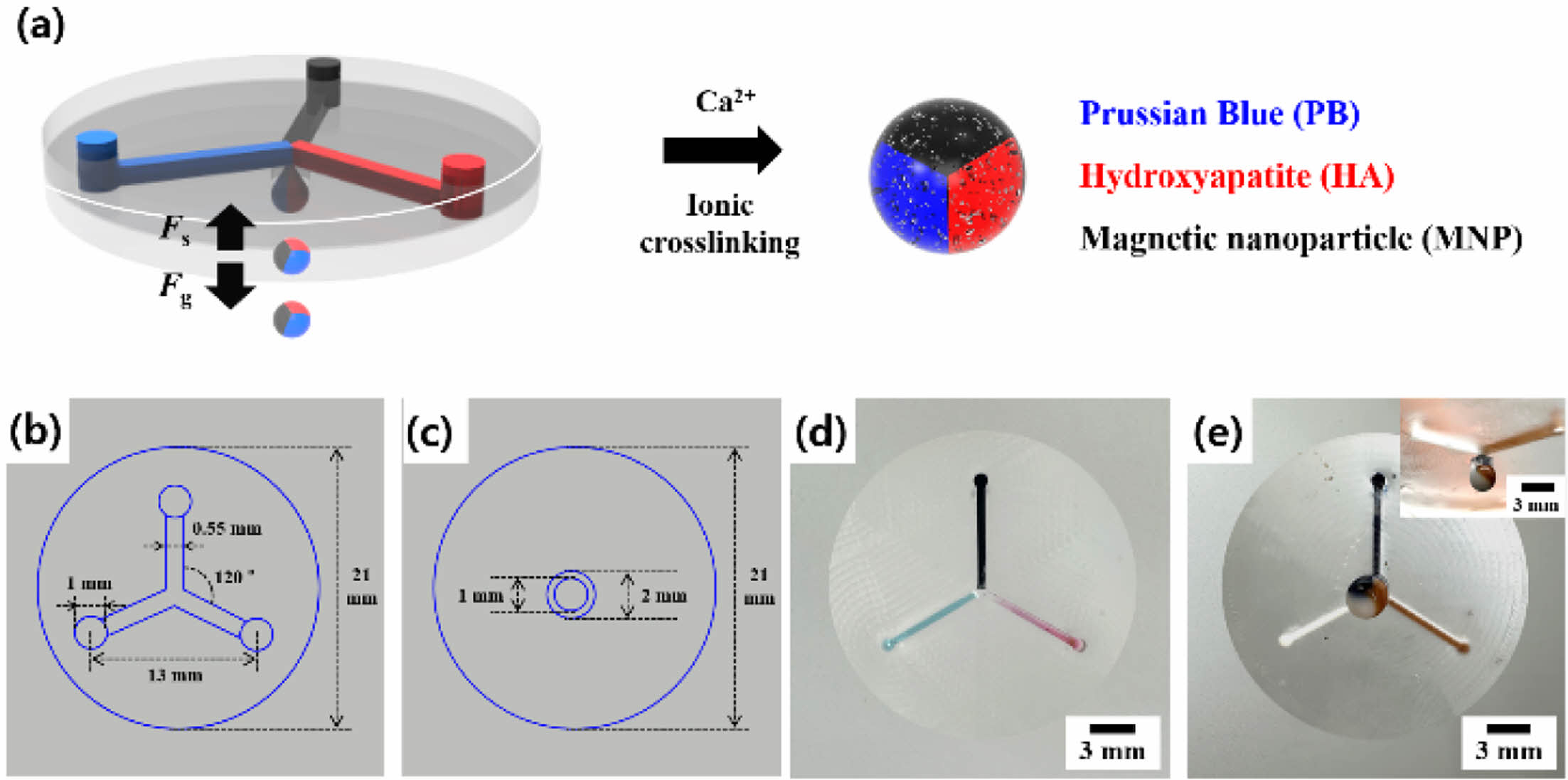 맞춤형 기능성 재료(functional material)에 대한 수요 증가와 더불어 합성 플랫폼(synthetic platform)의 기술집약적 발전을 통해 단일 재료에서 다양한 기능성을 갖는 스마트 재료 개발에 대한 관심이 증가되고 있다.1,2 특히 첨단과학 및 이에 대한 응용분야에서 다기능성 재료의 쓰임이 활발해짐에 따라 물리화학적(physicochemical) 제어가 이루어진 광범위한 스케일 내에서 기능성 재료 제조를 위한 기술들이 개발되고 있다.3-5 다기능성 재료는 선택적 함입(encapsulation) 및 방출(releasing), 외부 자극에 대한 반응성(reactivity), 그리고 다중성분 인코딩(encoding) 뿐만 아니라 이들의 조합을 바탕으로 새로운 특성에 대한 시너지 효과(synergy effect)를 유도할 수 있음에 큰 의의가 있다.6 예를 들어, Joshi 등은 바이오 센싱(biosensing), 약물 전달(drug delivery), 그리고 자기 공명 영상(magnetic resonance imaging)을 하나의 시스템에 통합함으로써 이를 구현할 수 있는 다기능성 미세입자(multifunctional microsphere)를 개발하였으며,7 Maeda 등은 원심력 기반의 미세유체 시스템을 통해 여러 개의 구획이 있는 3차원 구형 입자를 제조함으로써 입자 내부로 기능성 나노입자 및 세포들에 대한 함입을 통해 다양한 응용 가능성을 검증하였다.8 따라서 기능성의 확장을 통해 다기능성 재료를 개발함으로써 이를 사용할 수 있는 응용분야의 확장을 유도할 수 있다.