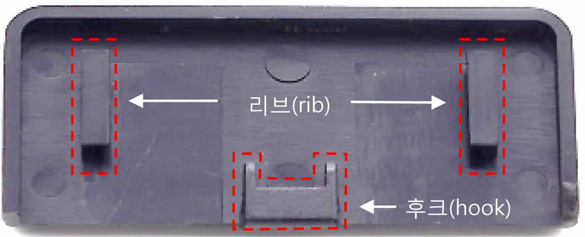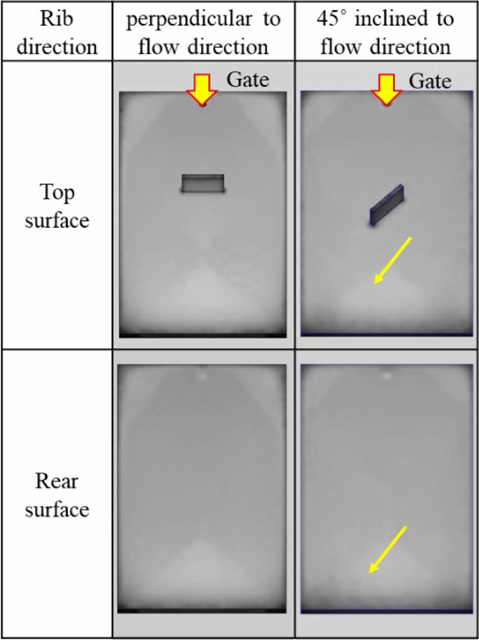 실험에 의한 배향 관찰. 리브에서의 배향:Figure 12은 Figure 3에 설명한 실험 모델로 사출성형한 시편에서 리브의 방향과 두께에 따른 외관을 보여준다. 흐름 방향으로 설계된 리브의 경우 리브를 지난 후 리브 길이 방향을 따라 얼룩이 뚜렷하게 나타난다. 얼룩은 리브 두께가 0.6 mm일 때보다 리브 두께가 0.9 mm일 때 더 선명하다. 리브가 수지 흐름과 직각 방향으로 설계된 경우 리브의 양쪽 가장자리를 따라 얼룩이 흐릿하게 나타난다. 수지 흐름과 45o 방향으로 마주하는 리브에서의 얼룩은 흐름과 직각 방향인 리브의 얼룩보다 뚜렷하지만 흐름 방향 리브에서 관찰되는 얼룩만큼 선명하지는 않다. 이 경우에 리브 가장자리를 따라 나타나는 얼룩은 흐름 방향으로 기울어진 왼쪽 가장자리가 오른쪽 가장자리에 비해 선명하다. 리브가 세워진 반대면에서도 얼룩이 관찰되는데 수지의 흐름 방향으로 세워진 리브의 반대면에서 나타나는 얼룩은 비교적 선명하지만 수지 흐름과 직각 방향의 리브와 45o 방향인 리브에서의 얼룩은 얼룩의 경계가 불분명하고 밝기 차이도 크지 않다.