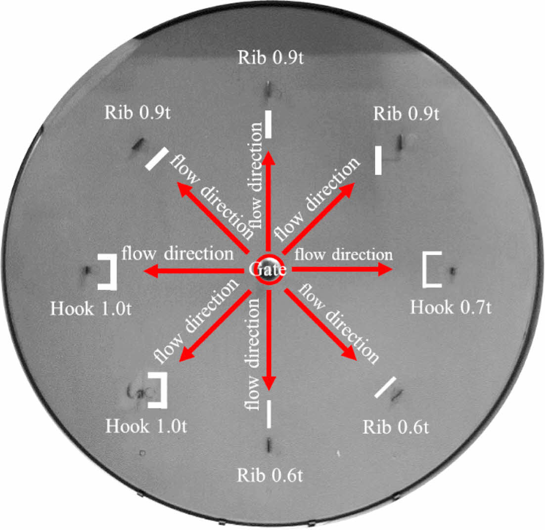 실험. 돌출부를 지나 발생하는 알루미늄 플레이크의 배향을 하나의 금형에서 관찰하기 위해 Figure 3와 같이 두께가 3 mm인 평판 위에 다양한 돌출부를 설계하였다. 돌출부의 종류와 두께, 그리고 수지의 흐름과 돌출부가 만나는 방향을 달리하여 설계하였다. 리브의 두께는 0.6 mm와 0.9 mm, 후크의 두께는 0.7 mm와 1.0 mm이며 평판의 두께에 대하여 리브는 각각 20, 30%, 후크는 각각 23, 33%의 비율로 설계하였다. 수지의 흐름과 돌출부가 만나는 각도의 영향을 비교하기 위해 흐름과 평행한 방향, 45o 방향, 직각 방향으로 리브를 설계하였다. 후크는 흐름의 반대 방향과 45o 방향으로 배치하였다.