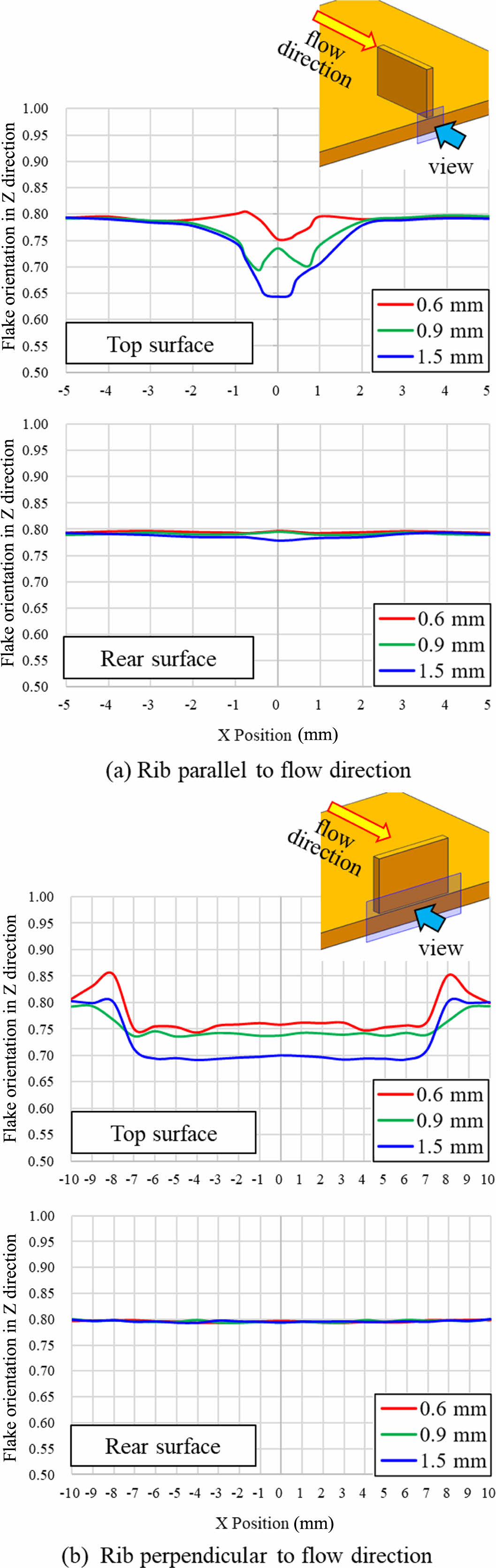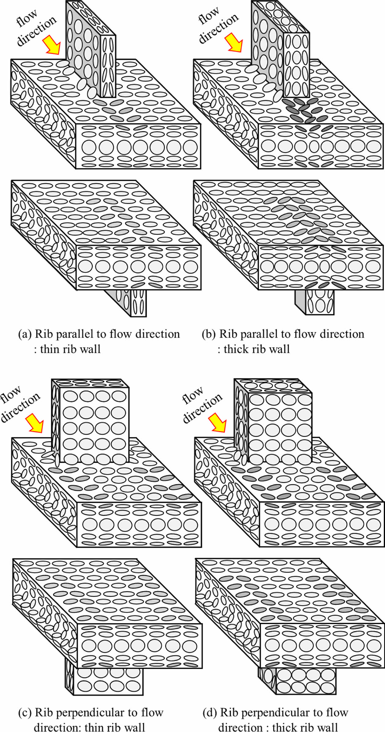 Figure 4 Effect of flow directions and thickness on the orientation of flake at the center of the rib. |