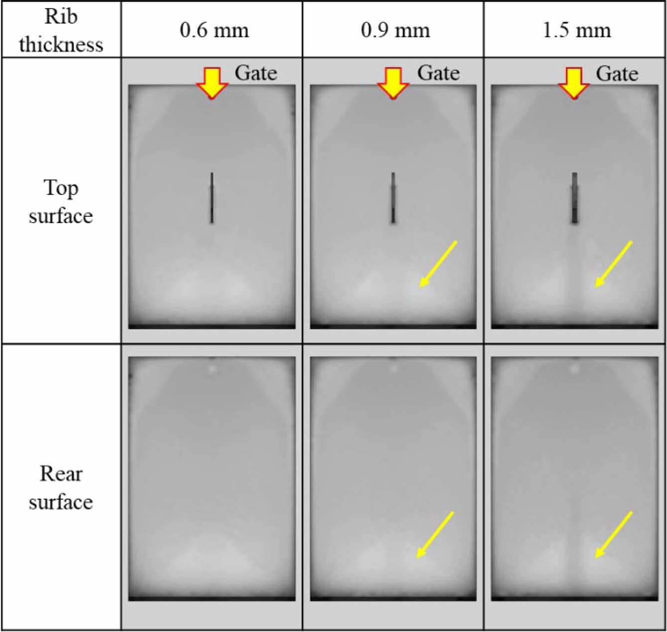 시뮬레이션과 실험의 비교. 리브가 있는 시편의 시뮬레이션 결과인 Figure 6에서 리브의 두께가 두꺼울수록 시편 표면의 얼룩이 선명해질 것으로 예측하였다. 리브가 있는 시편의 실험 결과인 Figure 12에서 리브의 두께가 0.6 mm인 경우보다 0.9 mm인 경우에 얼룩이 더 뚜렷하게 나타나 시뮬레이션과 실험이 잘 일치하였다. 그러나 시뮬레이션에서는 리브 두께가 0.6 mm인 경우 표면에 얼룩이 생기지 않을 것으로 예측하였으나 실험에서는 흐름 방향을 따라 얼룩이 나타나 시뮬레이션 결과와 차이를 보였다. 리브의 방향에 따른 외관 예측의 경우 시뮬레이션(Figure 7)과 실험(Figure 12) 모두 수지의 흐름 방향으로 세워진 리브에서 나타나는 얼룩이 흐름 직각 방향 리브의 얼룩보다 뚜렷하게 나타났다. 리브가 세워진 반대면에서의 표면은 두께 0.6 mm에서는 얼룩이 예측되지 않았으나 실험에서는 모든 두께에서 관찰되었다.