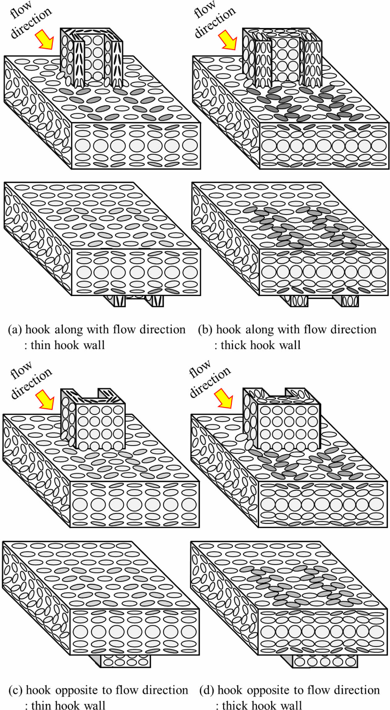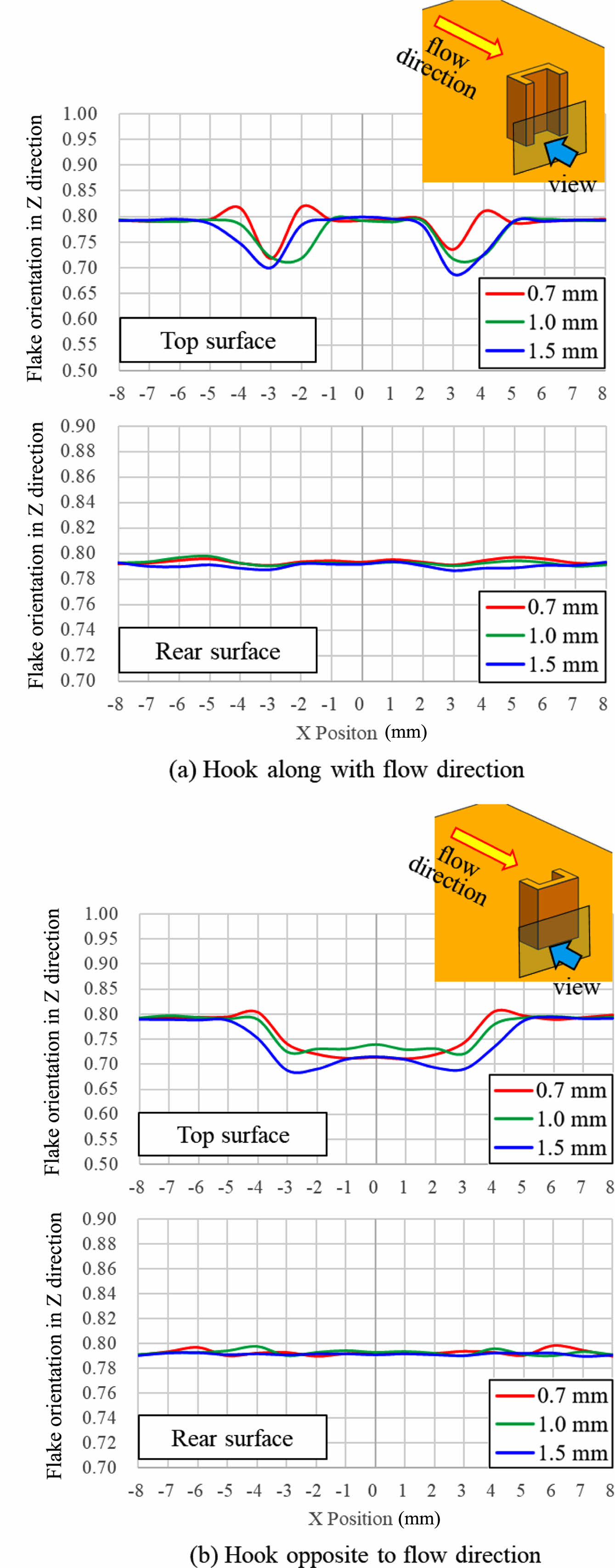Figure 8 Effect of flow directions and thickness on the orientation of flake at the center of the hook. |