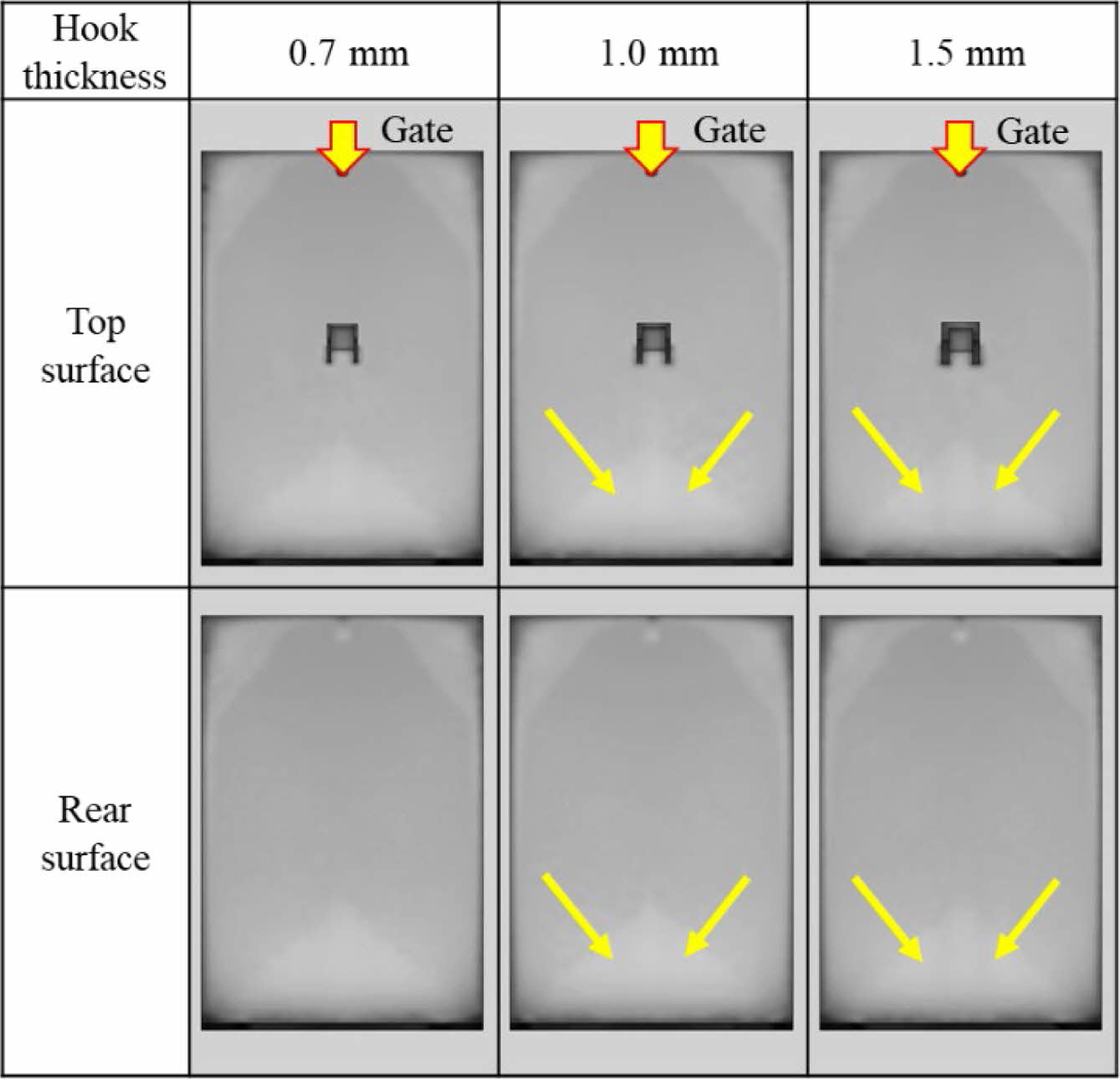 후크에서의 배향: Figure 13는 후크 꺾임 부분의 방향과 후크의 두께에 따른 외관을 보여준다. 후크의 꺾임 부분이 흐름 방향으로 설계된 경우 꺾임 부분을 따라 두 갈래의 얼룩이 나타난다. 후크의 두께가 0.7 mm인 경우 얼룩의 폭이 넓고 깊이는 얕게 나타나지만 후크 두께가 1.0 mm일 때는 얼룩의 폭이 좁고 깊이가 깊어 표면 불량이 뚜렷하다. 후크를 지나며 발생하는 얼룩은 후크 면보다 후크 반대면에서 더 뚜렷하게 나타난다. 후크의 두께가 1.0 mm로 동일할 때, 수지 흐름과 45o 방향인 후크 뒤에서 나타나는 얼룩이 흐름 방향의 후크보다 더 흐릿하게 나타났다.