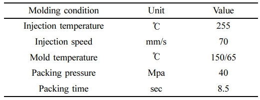실험에 사용된 사출기는 JSW1300(JSW Co., Japan)이며, Table 1에 사출조건이 나타나 있다. 사출온도는 255 ℃이며 금형온도는 가동측을 150 ℃, 고정측을 65 ℃로 설정하였다. 캐비티를 충전할 때의 사출속도는 70 mm/s이며, 보압은 40 MPa로 8.5초 동안 적용하였다.