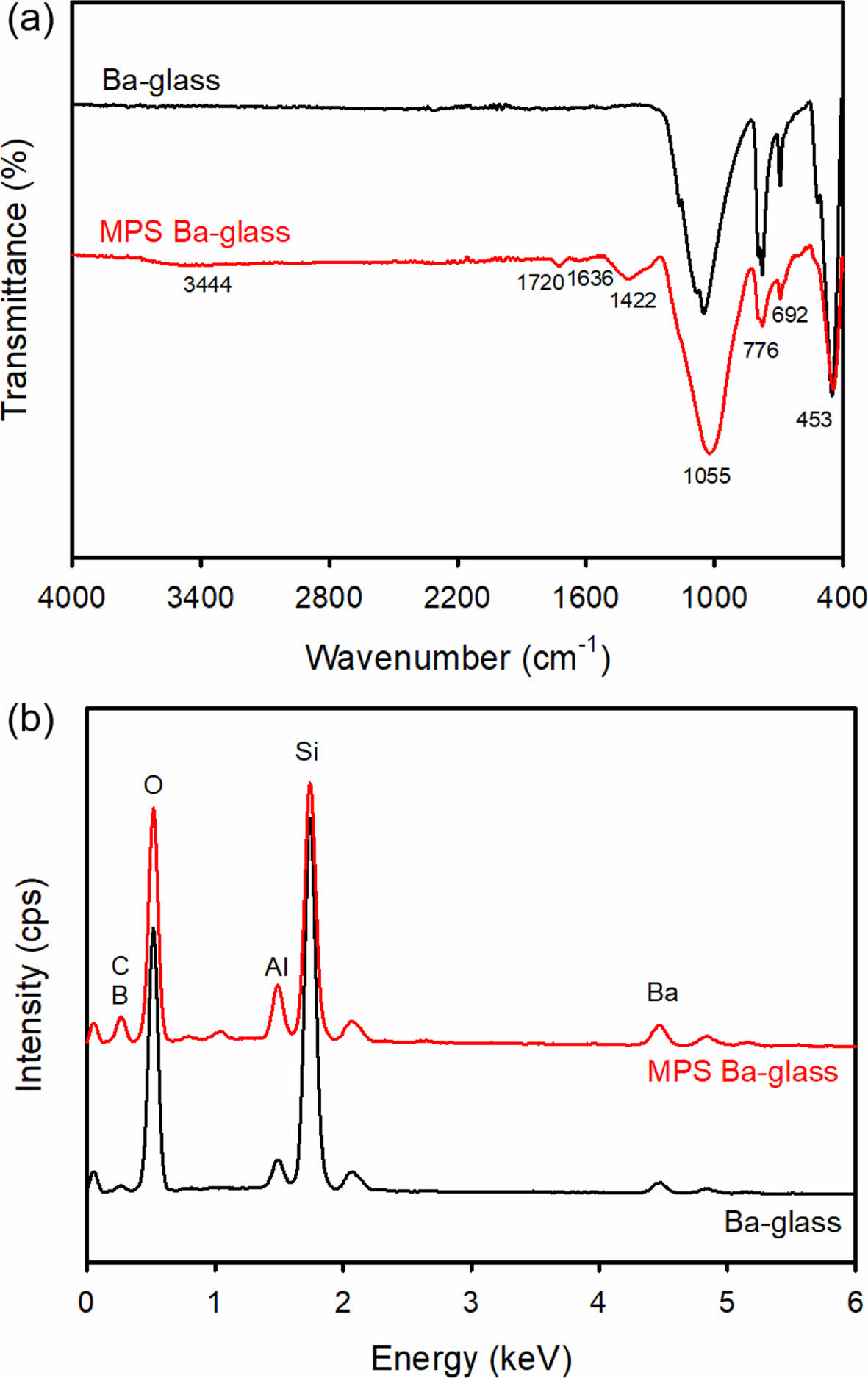 Figure 2 (a) ATR-FTIR; (b) EDX spectra of Ba-glass and MPS Baglass particles. |