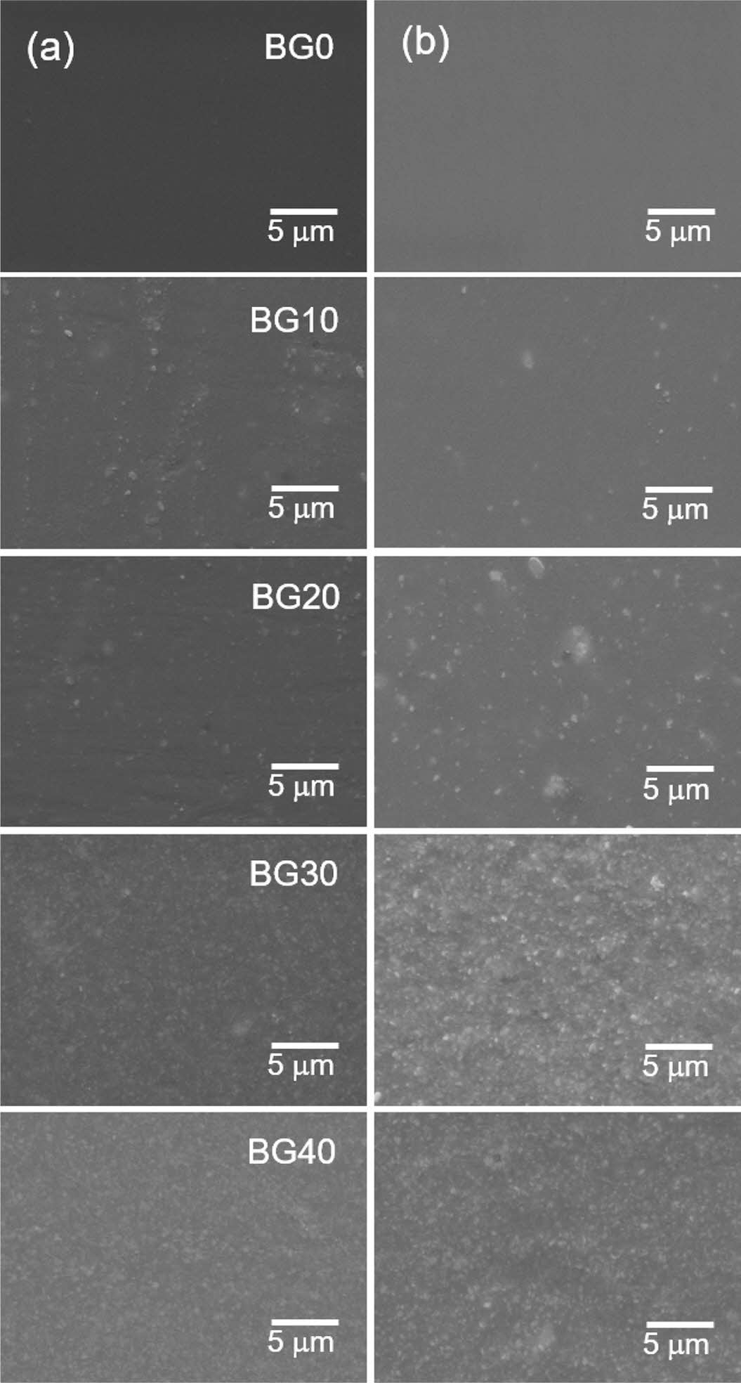 Figure 3 SEM micrographs: (a) surface; (b) cross-section of composite temporary crowns containing different contents of Ba-glass particles. |