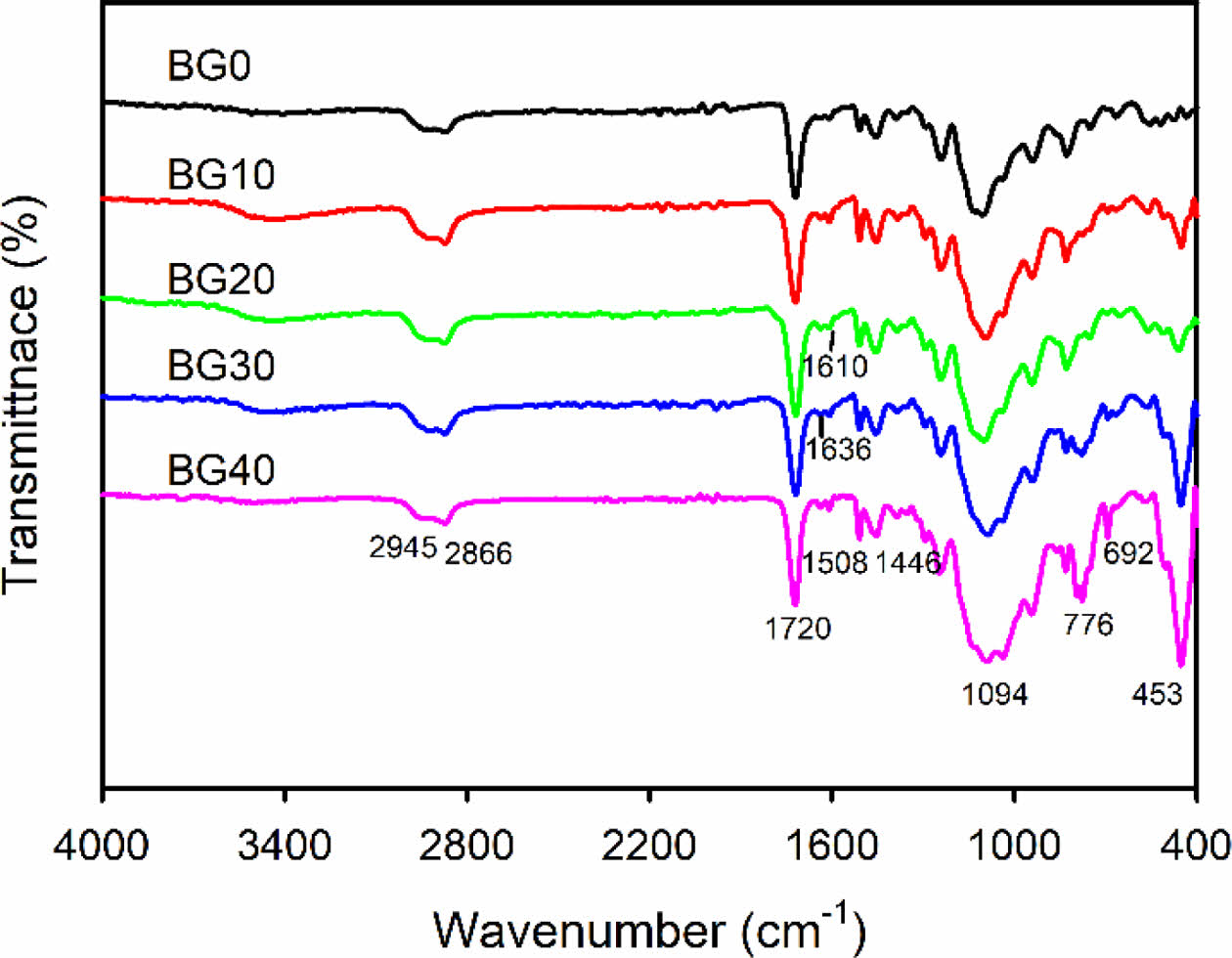 Ba-glass 입자의 사용량에 따른 유무기 복합 임시치아의 표면 특성 변화를 ATR-FTIR을 이용하여 분석하였다. 모든 유무기 복합 임시치아에서 레진 고분자의 C-H stretching vibration에 기인하는 특성피크가 2945 및 2866 cm-1에서 확인되었고, C=O stretching vibration에 기인하는 피크가 1720 cm-1에서 관찰되었다(Figure 4).20,21 또한 aliphatic C=C stretching과 aromatic C=C 및 C-C stretching에 해당하는 피크가 1636, 1610, 1508 및 1446 cm-1에서 관찰되었고, C-O-C stretching에 해당하는 피크가 1094 cm-1에서 관찰되었다. 특히 Ba-glass 입자가 도입됨에 의해서 776, 692 및 453 cm-1에서 Ba-glass에 기인하는 특성피크가 확인되었다.18,19