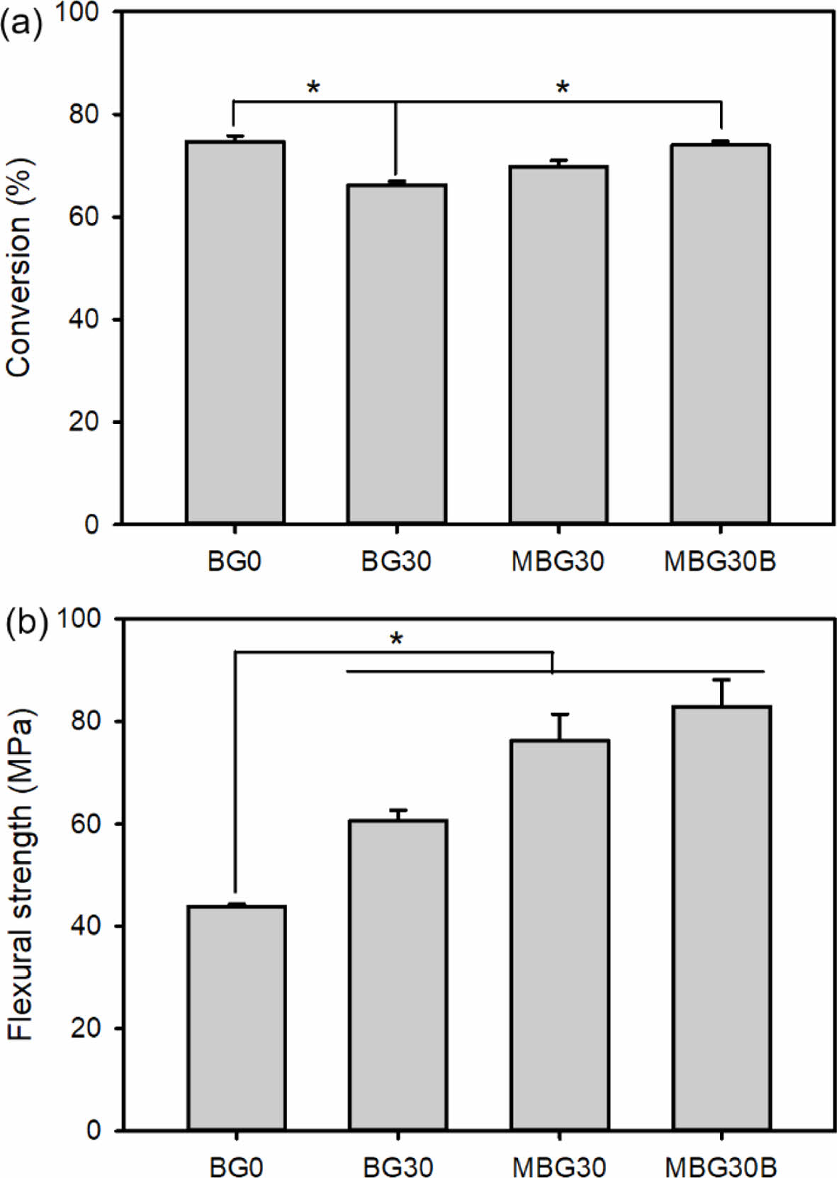 메타크릴기를 표면에 도입함에 의해서 자외선 및 열에 대한 반응성을 부여된 MPS Ba-glass 입자와 이중경화 시스템이 제조된 유무기 복합 임시치아의 중합전환율과 굴곡강도에 미치는 영향을 조사하고 그 결과를 Figure 9에 나타내었다. Figure 9(a)에서 볼 수 있는 것처럼 표면 개질된 MPS Ba-glass 입자를 사용하고 광경화 단독으로 제조한 유무기 복합 임시치아인 MBG30은 Ba-glass 입자를 사용하여 제조한 유무기 복합 임시치아인 BG30보다 높은 중합전환율을 보였고, 이는 입자 표면에 도입된 MPS가 광경화 반응에 참여하여 전체 반응의 중합전환율이 높아진 것으로 판단되어진다. 특히 표면개질된 MPS Ba-glass 입자와 광경화 및 열경화의 이중경화 시스템을 이용하여 제조한 유무기 복합 임시치아인 MBG30B는 74.0%로 Ba-glass 입자를 사용하지 않은 BG0와 유사한 중합전환율을 보였다. 또한 표면 개질된 MPS Ba-glass 입자의 사용과 이중경화 시스템의 도입이 유무기 복합 임시치아의 기계적 강도에 미치는 영향을 조사한 결과 MBG30B 임시치아의 굴곡강도는 89.2 ± 5.3 MPa로 BG0 임시치아(43.8 ± 0.5 MPa) 대비 약 2배 및 BG30 임시치아(60.6 ± 2.1 MPa) 대비 약 1.4배의 굴곡강도 향상을 보였다(Figure 9(b)). 이들 결과로부터 표면 개질된 MPS Ba-glass 입자의 사용과 이중경화 시스템의 도입은 유무기 복합 임시치아의 중합전환율 및 기계적 특성 향상에 많은 영향을 준다는 것이 확인되었다.