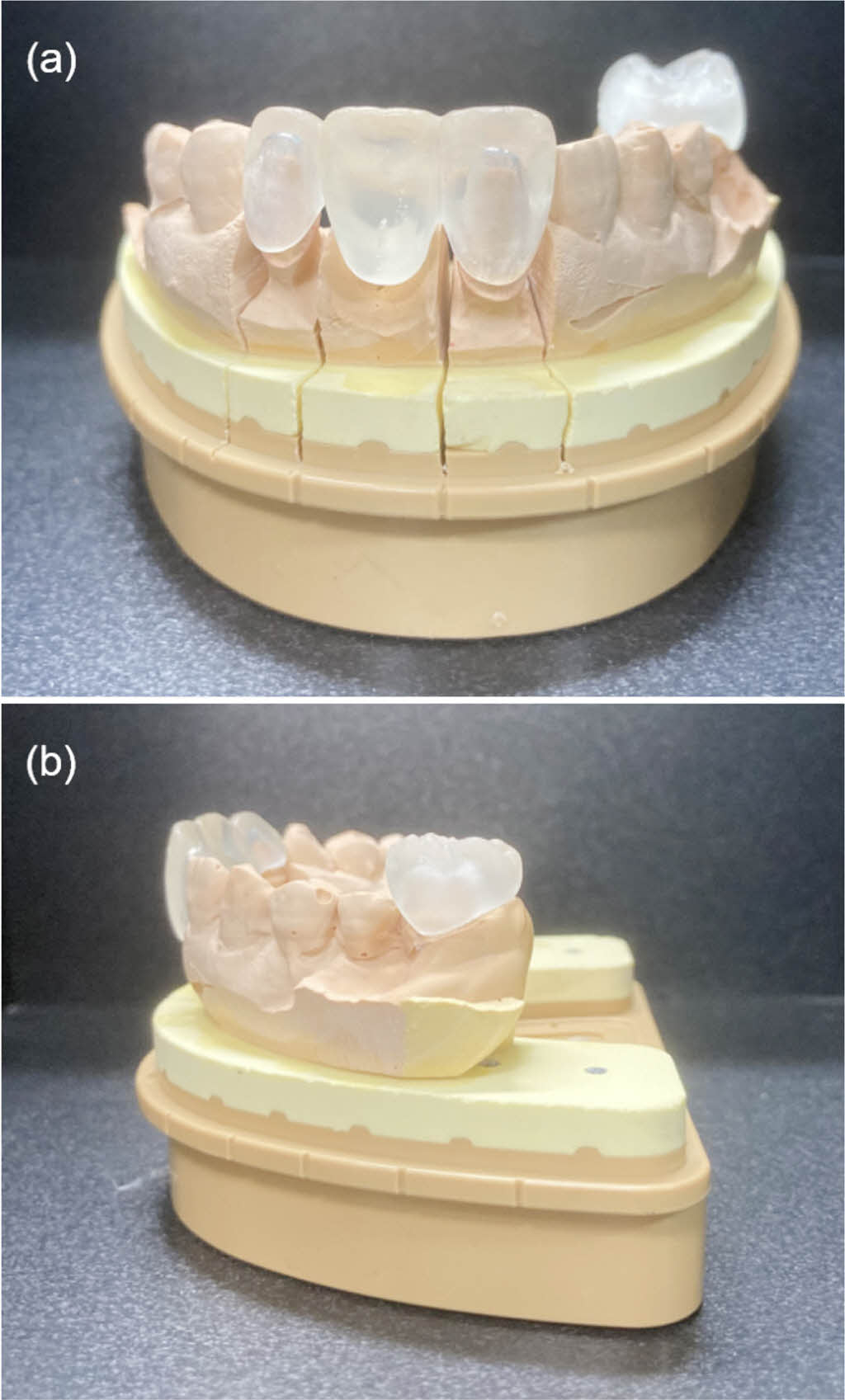 Figure 10 Digital images: (a) temporary bridge; (b) crown containing MPS Ba-glass particles fabricated via a 3D printing method and dual curing system. |