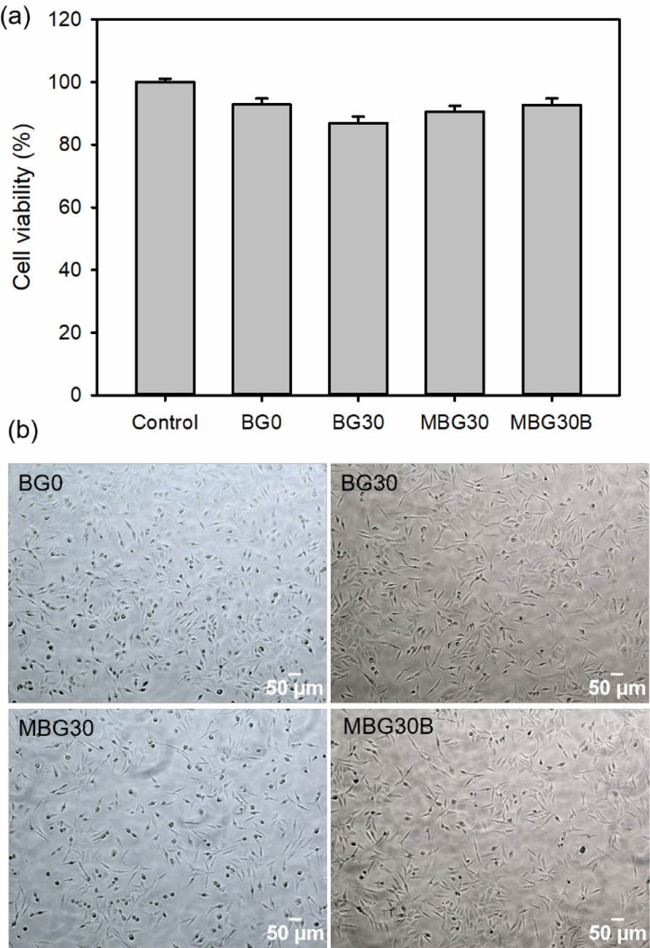 Figure 11 Proliferation and morphology of the L-929 cells cultured in the presence of extracts of composite crowns and bridges: (a) Relative cell viability determined using the MTT assay; (b) morphology of the L-929 cells after culturing for 72 hours. |