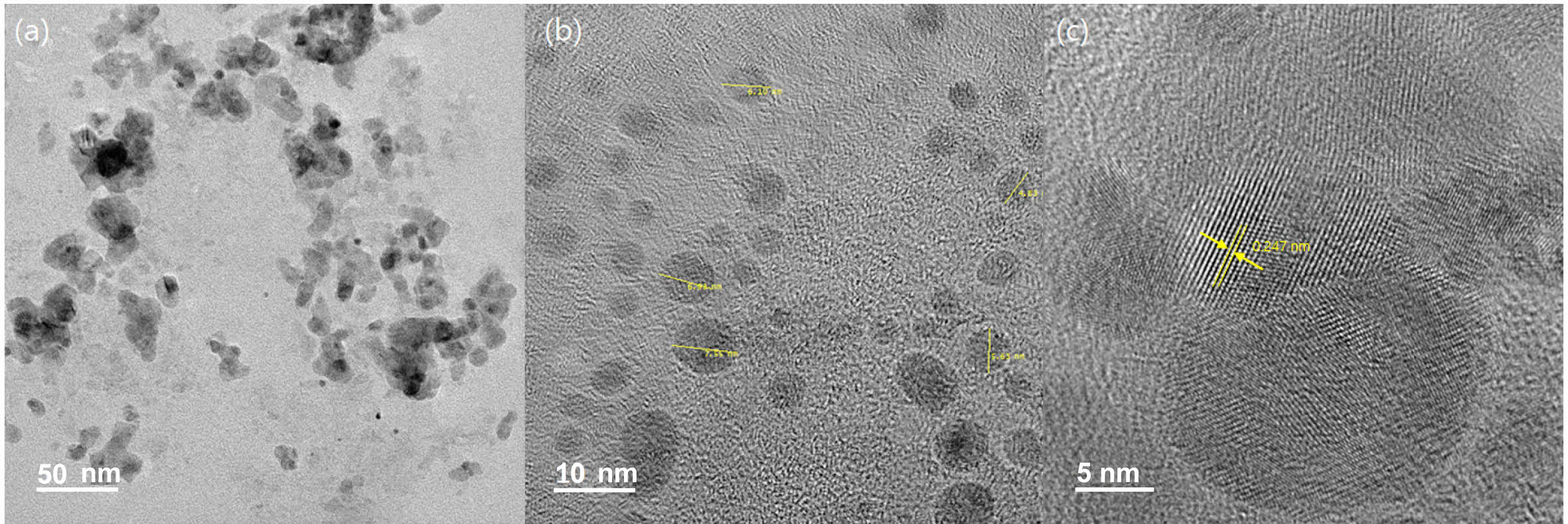 TEM Studies of Bio Synthesized QD. The QDs were produced from banana peel discarded using a straightforward hydrothermal method, as depicted in Figure 1(a-c). The morphology and dimensions of the produced QDs were analyzed using HRTEM. Figure 1(a) illustrates that the particle size collections from 5 to 7 nm, with a regular diameter of approximately 5 nm, indicating a broad dispersion and a spherical morphology. The HRTEM pictures (Figure 1(c)) indicate that the produced QDs possess distinct lattice fringes, suggesting a robust crystalline arrangement. The inside of QDs exhibits a significant degree of crystallinity in contrast to the outside surface, as evidenced by TEM images.31