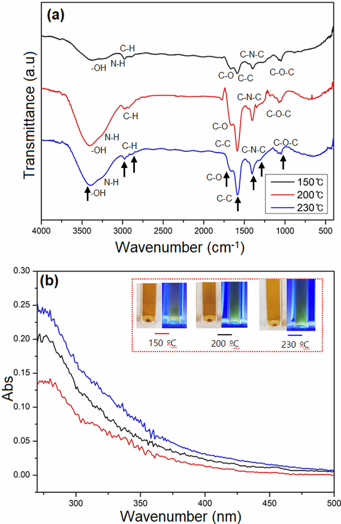 Figure 2 (a) FTIR spectra; (b) UV-Vis absorbance spectrum of prepared carbon QD with various synthesis temperature. |