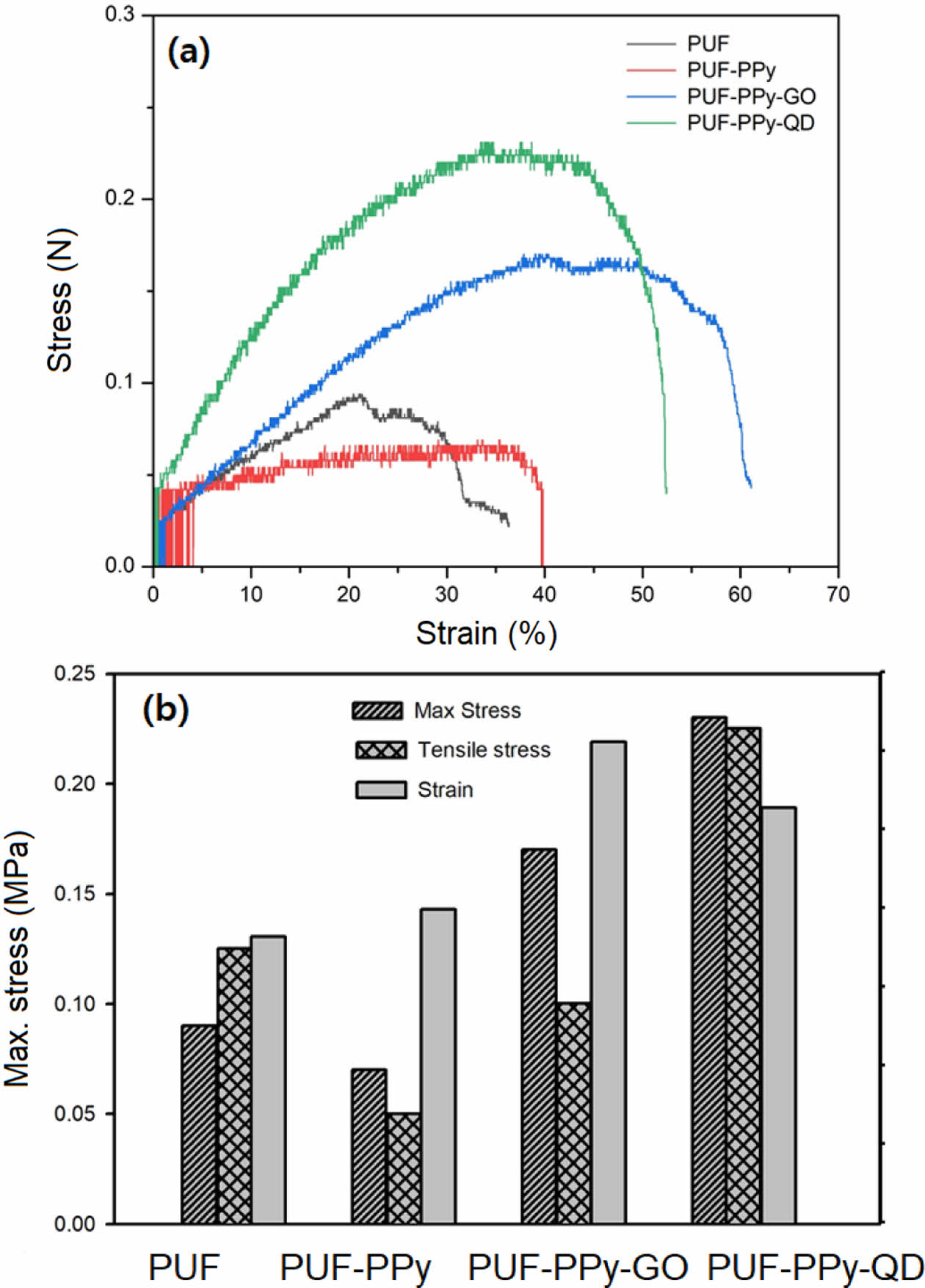 The maximum tensile stress and strain can be determined from the stress-strain curves (Figure 4(a)) illustrated in Figure 4(b). Including conductive polymers like PPy into the PUF by vapor phase polymerization can slight decrease of mechanical properties, including maximum stress, and tensile stress due to the PPy's and depositions of GO or QD on the PUF-PPy composite, which resulted in improved mechanical characteristics. The PUF-PPy-QD and GO matrixes exhibited high maximum stress and tensile stress than PUF, respectively The maximum strain of the PUF-PPy-QD and PUF-PPy-GO were dramatically enhanced associated to PUF, demonstrating that QD and GO impregnation renders the PUF additional flexible and extensible due to more rigid secondary interactions between PUF and QD or GO.31
