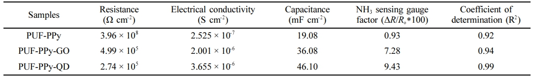 Table 1 Comparisons of Electrochemical Properties and Ammonia Sensor Performances of Various PUF Based Composites Prepared with Different Fabrication Processes |