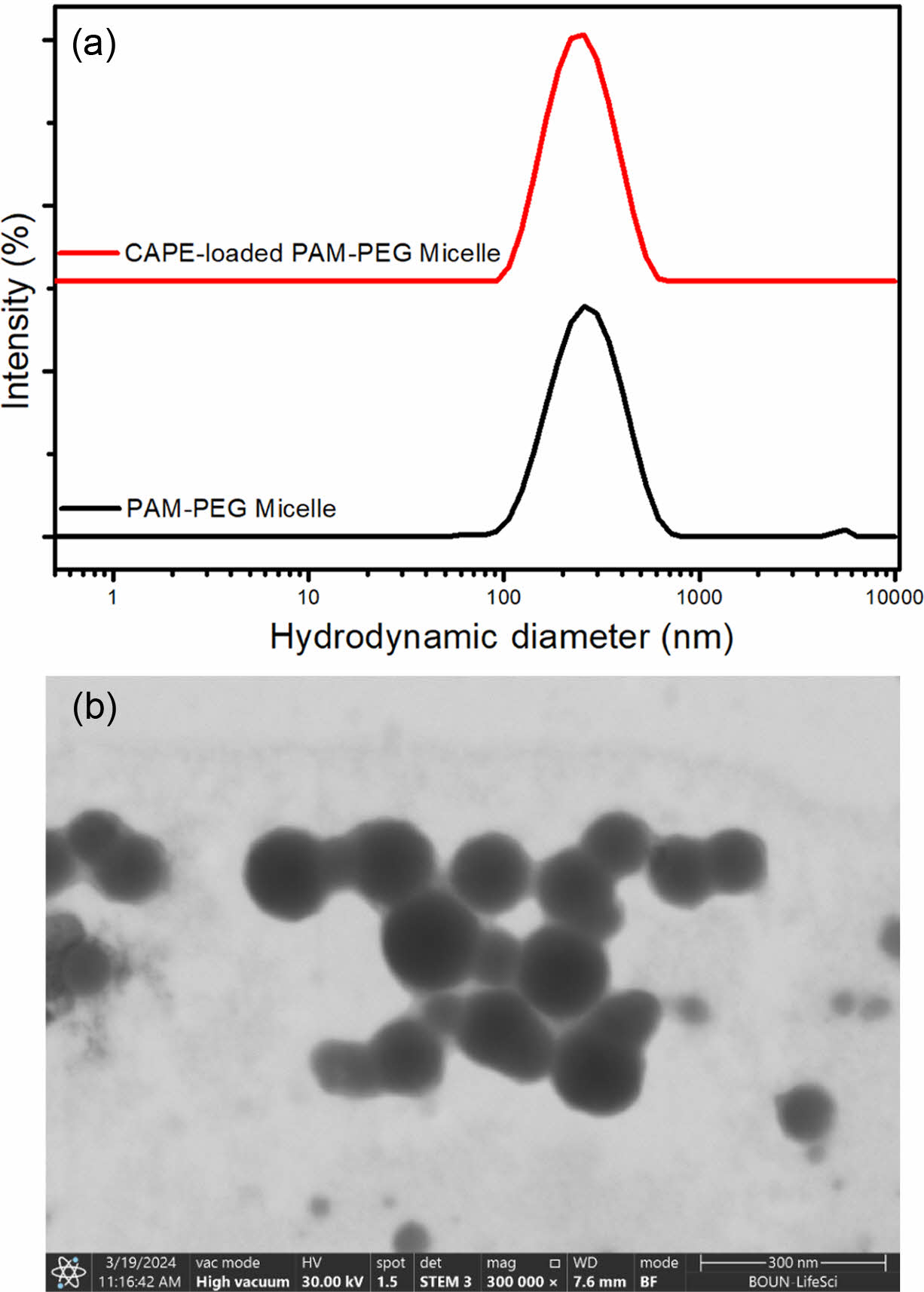 Figure 2 (a) Hydrodynamic size distribution of free and CAPEloaded PAM-PEG micelles based on the intensity; (b) SEM image of CAPE-loaded PAM-PEG micelle acquired from STEM detector at 300 kX magnification. |