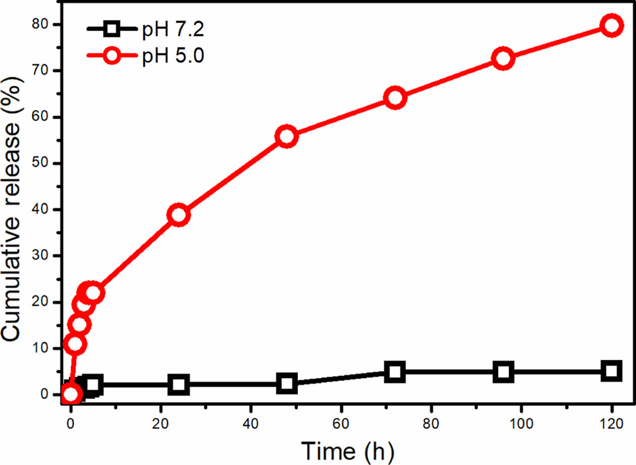 Figure 4 shows the cumulative release of CAPE from the micelle at acidic and neutral pH for 5 days. As seen, CAPE release from the micelle at physiological pH value is very low. In the first 24 hours, 2.14% of the encapsulated CAPE is released and after 5 days, only 5.04% of the drug is released. The low cumulative release can be attributed to the high hydrophobicity of the CAPE and tight packing of the micellar core. When the pH is reduced to pH 5.0, noticeably different cumulative release profile was obtained. The cumulative CAPE release reached to 38.8% after 24 hours at pH 5.0, while 79.7% cumulative release was obtained after 5 days. The remarkable increase in the release at acidic pH directly indicates the pH sensitive degradation of the PAM block in which the Schiff base (imine) groups (CH=N) are dissociated into aldehyde and amine groups.4 CAPE is released to the medium after degradation of the hydrophobic PAM block. The very low release of CAPE at neutral pH value can protect the hydrophobic cargo molecule until reaching to the lysosome or cancerous tissue.