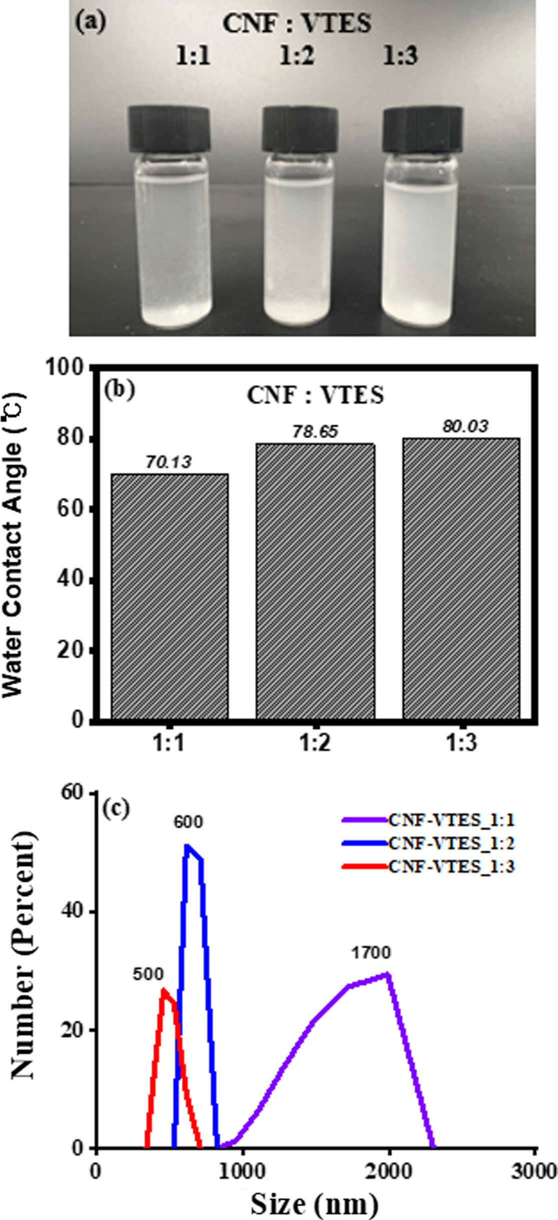 Figure 1 Evaluation based on molar ratio of CNF and VTES: (a) water dispersibility; (b) water contact angle; (c) particle size analyzer. |