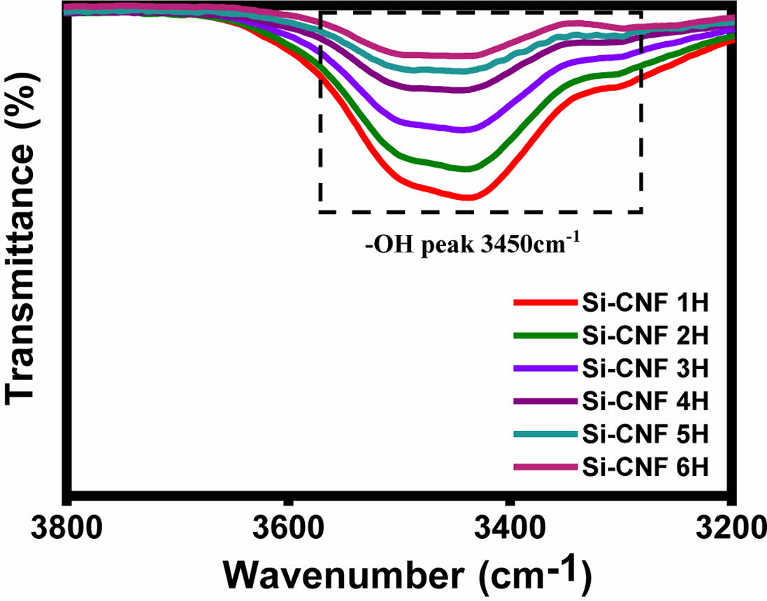 5 L 비이커에 3 L 에탄올 수용액(80 wt%)을 준비하고 에탄올 수용액에 1 kg의 CNF(고형분 함량 2 wt%)를 천천히 첨가하고 교반하면서 분산시켰다. CNF에 실란 결합이 이루어지기 위해, 혼합물을 2시간 동안 에탄올 수용액에 분산시켜 가수분해를 촉진한 다음 VTES를 첨가하였다. 이 공정에서 VTES는 수화 반응을 통해 CNF 표면의 하이드록실기(3450 cm-1, -OH peak)와 결합하여 그래프팅을 통해 CNF 표면이 소수성으로 개질되었다. VTES를 첨가한 후, 혼합물을 25 ℃에서 5시간 동안 교반하였다. 개질율은 5시간 후에 감소했고, 6시간 후에는 더 이상의 개질은 관찰되지 않음을 푸리에 변환 적외선 분광법(Fourier transform infrared spectroscopy, FTIR)을 사용하여 하이드록실기의 변화를 관찰하였으며, 분석 결과를 Figure 2에 나타내었다.
