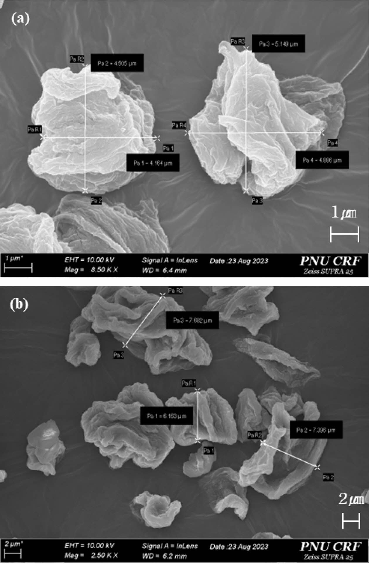 셀룰로오스 나노섬유 건조 및 분말화. 감압 여과 후 남은 용매를 제거하고 분말 샘플을 얻기 위해 분무 건조와 오븐 건조 두 가지 방법으로 진행하였다. 분무 건조는 10 wt% 농도의 2차 증류수에 분산된 Si-CNF상태에서 진행되었다. 입구 온도 190 ℃, 출구 온도 100 ℃, 유속 0.6 m3/L, 분무 속도 13000 rpm, 건조 후 샘플을 상온에서 냉각하였으며 분무 건조 공정은 시간당 100~200 g의 재료를 생산하였다. 20 wt% 이상의 농도로 2차 증류수에 Si-CNF를 분산시키면 파이프 막힘과 같은 문제가 발생하게 된다. 오븐 건조는 샘플을 오븐에 120 ℃에서 12시간 건조 후 상온에서 고속 교반기를 사용하여 분말화를 진행하였다. 고속 교반기는 스테인레스 재질의 이축날을 사용하여 15600 rpm으로 30초 진행하여 분말 형태의 샘플을 수득하였다. 두 방법 간에 생성된 분말의 크기는 약 1.5배의 차이가 있으며 분무 건조 분말 입자는 4~5 mm인 반면, 오븐 건조 및 고속 교반 처리 분말 입자는 6~7 mm였다. 분무 건조 방법은 오븐 건조 및 고속 교반 방법에 비해 더 미세한 분말을 생산하였으며 전계 방출 주사 전자 현미경을 통해 확인하였으며 분석 결과를 Figure 3에 나타내었다.