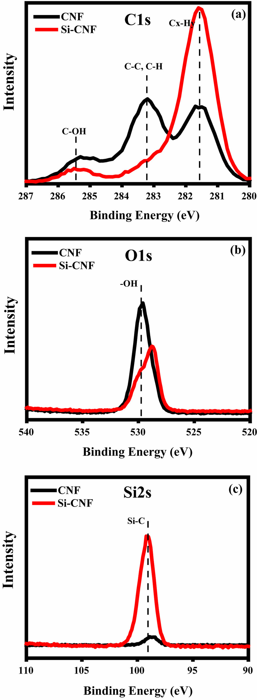 Figure 5 XPS spectra of (a) carbon; (b) oxygen; (c) silane difference between CNF and Si-CNF. |