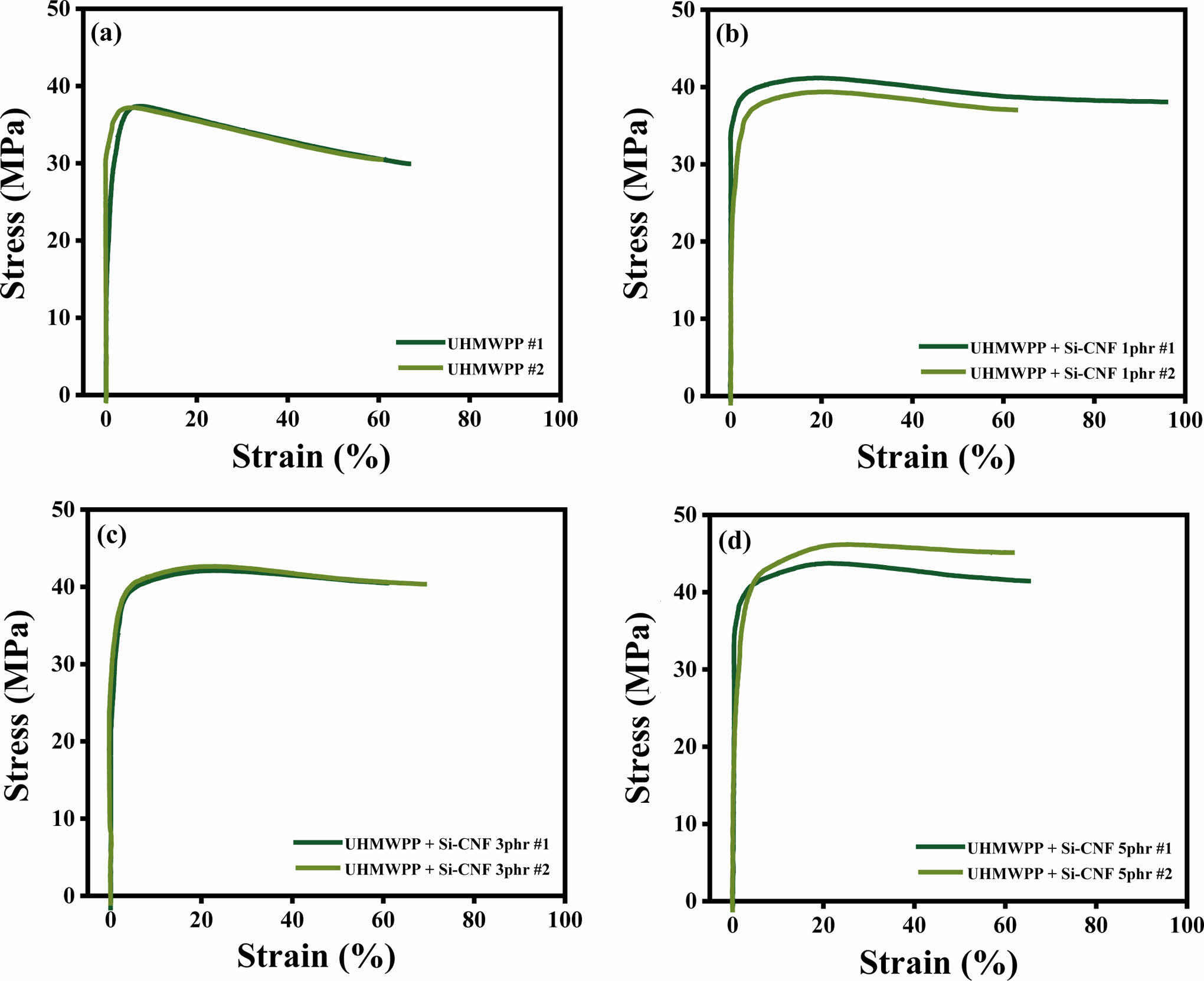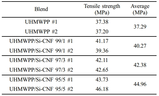 인장 강도 측정은 0, 1, 3, 5 phr(수지 100당 부분)의 다양한 Si-CNF 함량을 갖는 UHMWPP 복합체에서 수행되었다. Figure 7과 Table 1에 제시된 분석 결과는 Si-CNF 함량과 복합체의 인장 강도 사이에 Si-CNF의 조성비가 증가할수록 물리적 특성이 증가하는 상관 관계가 있음을 확인하였다.