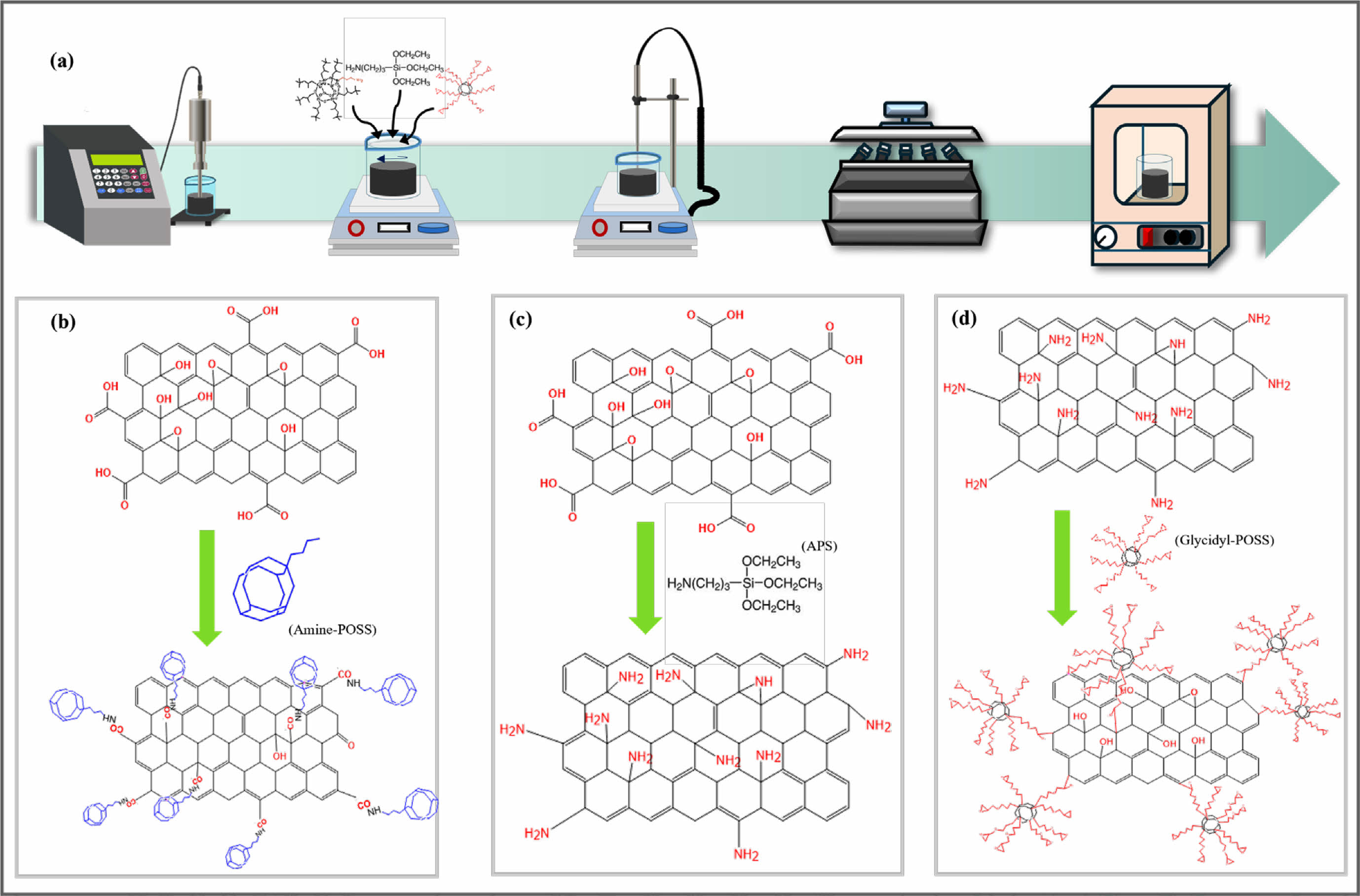 Figure 1 (a) Schematic of functionalized GO fabrication process and chemical structures of (b) GO and amine-GO-POSS; (c) GO-NH2; (d) glycidyl-GO-POSS. |