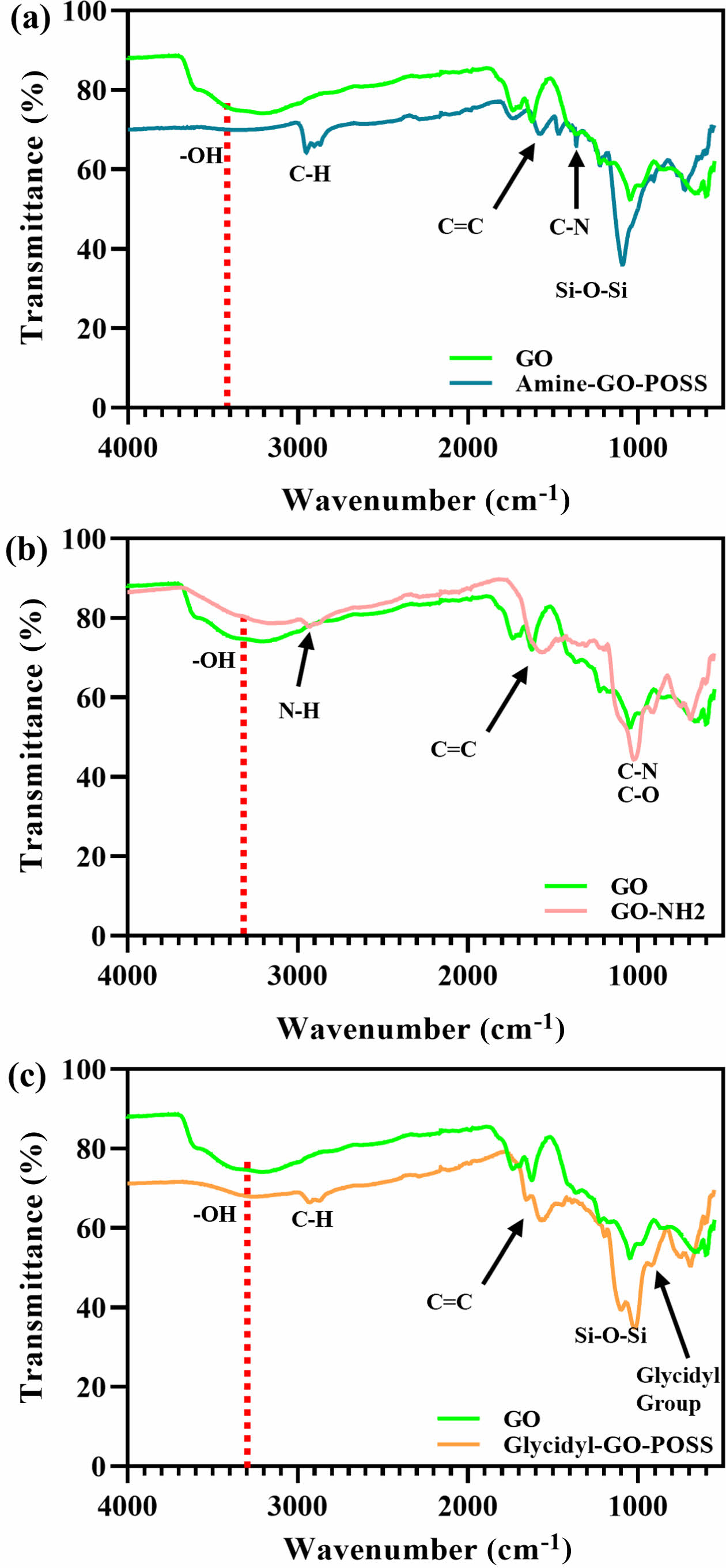 Functionalization of GO with POSS. The functionalization of POSS on the surface of GO is essential for increasing interfacial adhesion between the polymer matrix and nanoparticles. The FTIR spectra confirmed the successful introduction of POSS. Figure 2 shows the FTIR spectra of GO, amine-GO-POSS, GO-NH2, and glycidyl-GO- POSS. Figure 2(a) presents the FTIR spectra of GO and amine-GO-POSS. The broad peak at 3730 cm-1 in the GO powder corresponds to the –OH stretching vibration attributed to hydroxyl groups on the surface.11 The oxygen-containing functional groups in GO are identified by peaks at 1045, 1223, 1403, and 1773 cm-1. These peaks correspond to the stretching vibrations of C–O, C–OH, carboxyl C–O, and C=O.20 The peak at 1576 cm-1 is attributed to the stretching vibrations of the -NH2, while –C–NH2 has a distinct peak at 1357 cm-1. In particular, the strong peak at roughly 1090 cm-1 corresponds to the Si–O–Si group of POSS, indicating that POSS-amine was successfully grafted onto the GO surface.21 The grafting of APS onto GO is shown in Figure 2(b). The peak at 2885 cm-1 is associated with the stretching mode of NH2.22 Figure 2(c) shows the glycidyl-GO-POSS. The spectral area (890-950 cm-1) is distinguished by a peak at 918 cm-1, which is associated with the C–O–C (glycidyl group).20 These results demonstrate that GO can be successfully modified through covalent bonding with POSS-amine, APS, and POSS-glycidyl.