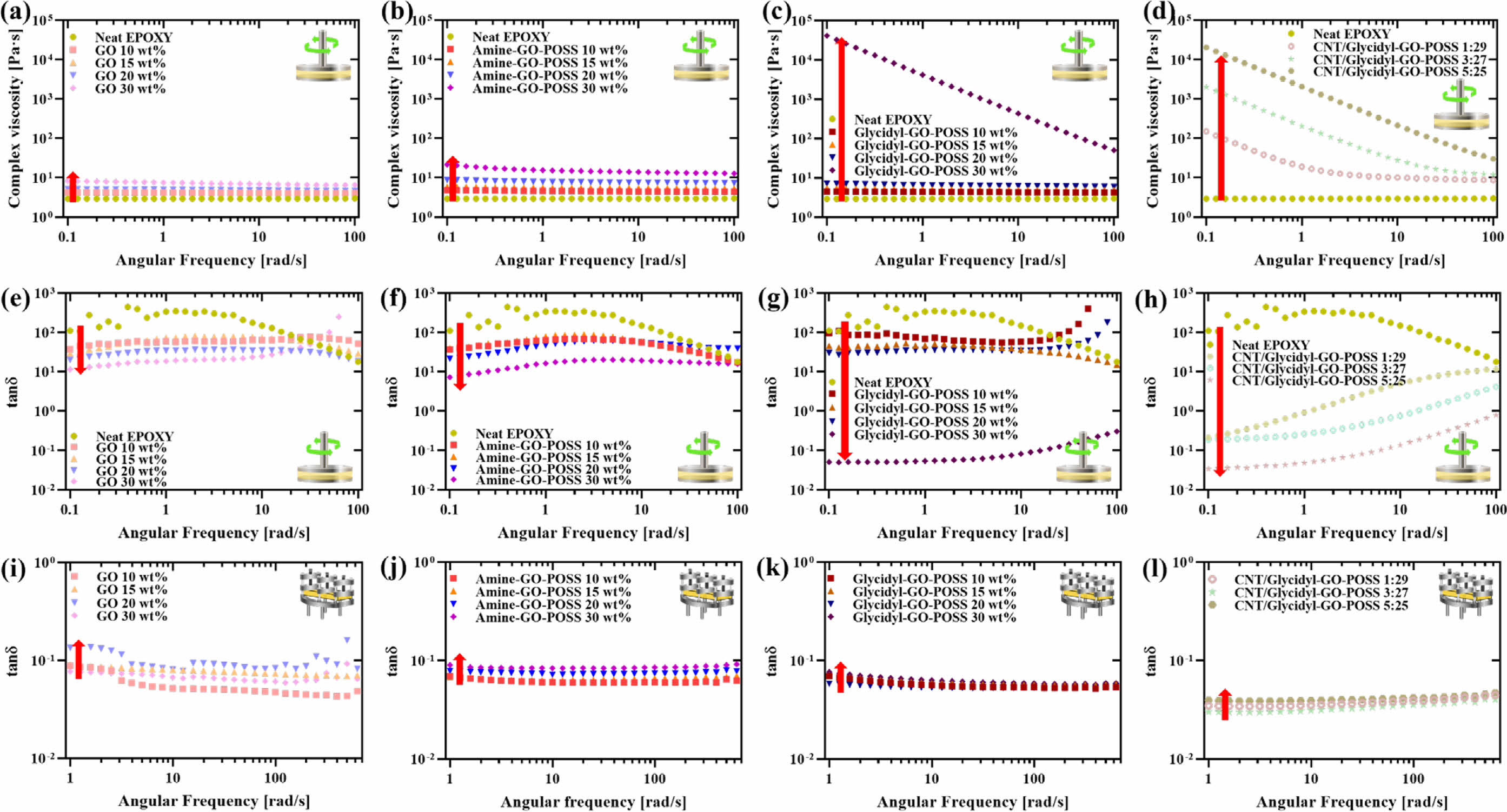 Figure 6 Complex viscosity of uncured epoxy nanocomposites: (a) GO/epoxy; (b) amine-GO-POSS/epoxy; (c) glycidyl-GO-POSS/epoxy; (d) CNT/glycidyl-GO-POSS/epoxy. Tan δ value of uncured epoxy nanocomposites; (e) GO/epoxy, (f) amine-GO-POSS/epoxy; (g) glycidylGO-POSS/epoxy; (h) CNT/glycidyl-GO-POSS/epoxy. Tan δ value of UV-cured epoxy nanocomposites; (i) GO/epoxy; (j) amine-GO-POSS/ epoxy; (k) glycidyl-GO-POSS/epoxy; (l) CNT/glycidyl-GO-POSS. |