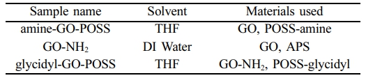 In case of Glycidyl-GO-POSS, firstly, the functional group of GO was modified to be an amino group (GO-NH2) by grafting APS. Subsequently, POSS-glycidyl was grafted through a substitution reaction between the amino group and POSS-glycidyl, resulting in Glycidyl-GO-POSS.