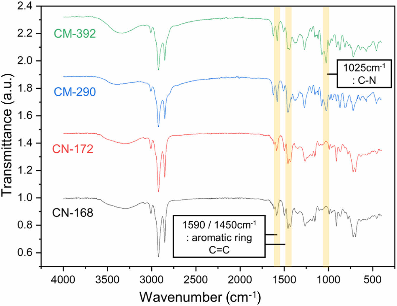 카다놀 기반 폴리올의 구조 분석. 카다놀 기반 폴리올의 구조 차이를 비교하기 위해 FTIR을 이용하였다. Figure 2를 보면, Mannich type 폴리올과 Novolac type 폴리올의 경우, 1590과 1450 cm-1에서 aromatic ring의 C=C 결합을 가지고 있음을 볼 수 있다.7 이는 카다놀의 특징인 벤젠고리와 높은 불포화도에 의한 것으로 사료된다. 또한 CM-290과 CM-392의 경우, Mannich type 폴리올의 특징인 3차 질소에 따른 C-N 피크가 1025 cm-1에서 나타난다.