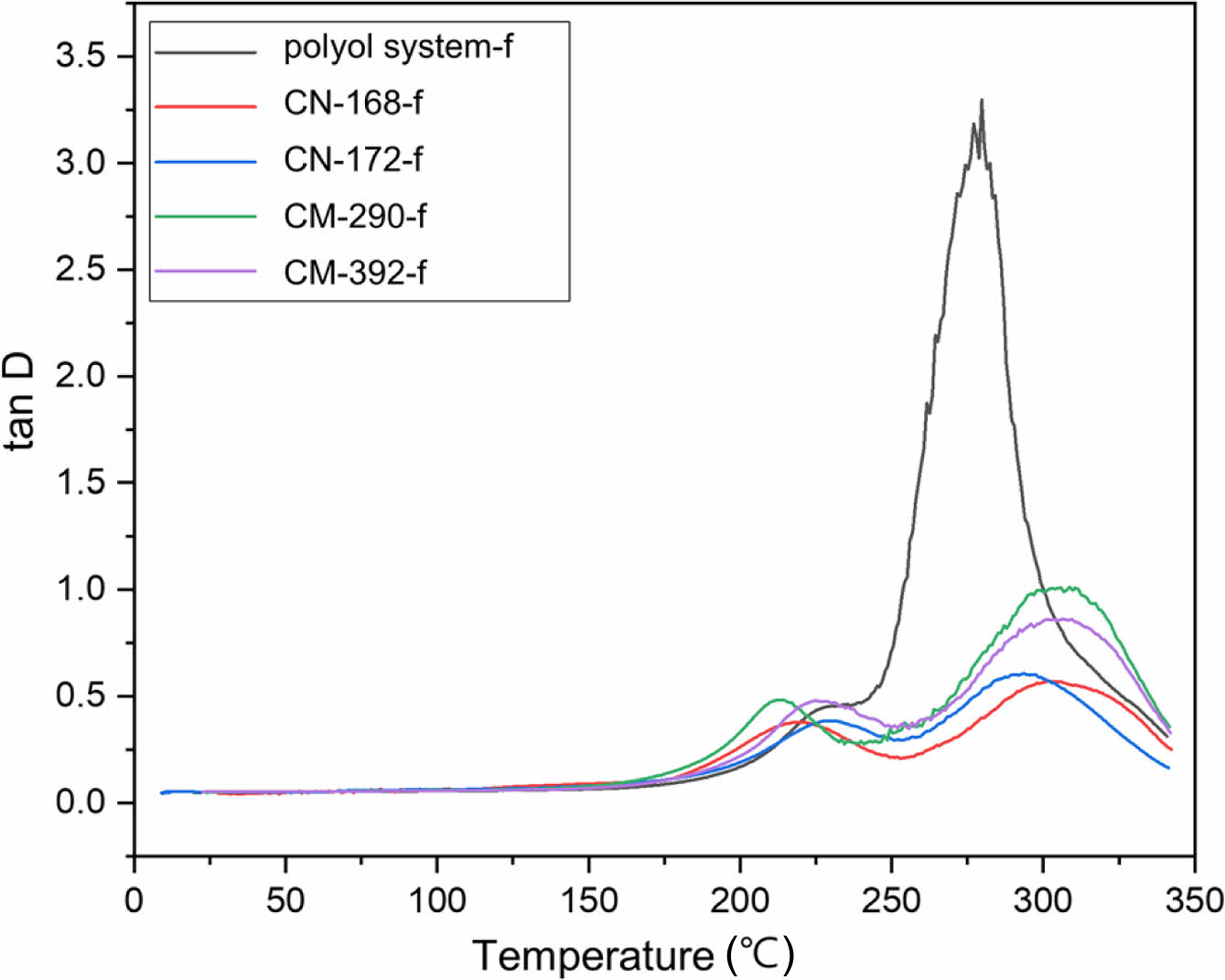 카다놀 기반 폴리올이 첨가된 RPUF의 Tg는 두 군데 존재하였다. 1차 Tg는 소프트 세그먼트인 지방족 탄소 사슬의 상 전이를 의미하고 2차 Tg는 하드 세그먼트의 상 전이를 의미한다.13